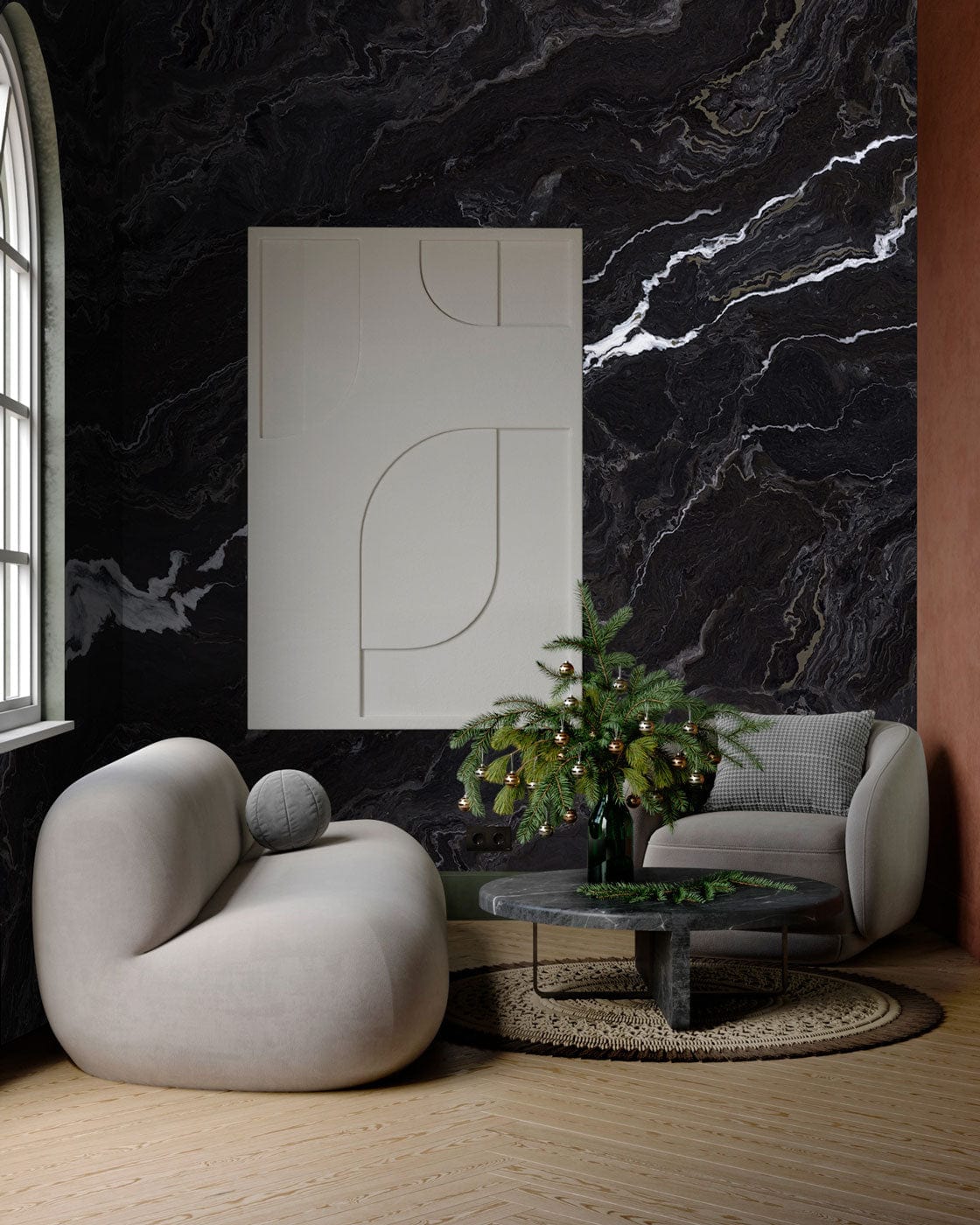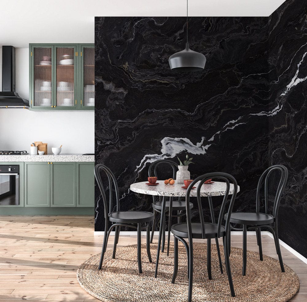 Midnight Elegance Marble Mural Wallpaper captures the mystique of swirling dark marble, with rich black tones accented by delicate white veining. This sophisticated design invites a timeless charm, effortlessly gracing any space with an aura of refinement. Its intricate textures and bold contrasts make it a standout piece, perfect for those seeking to infuse their interiors with an artistic and elegant touch.