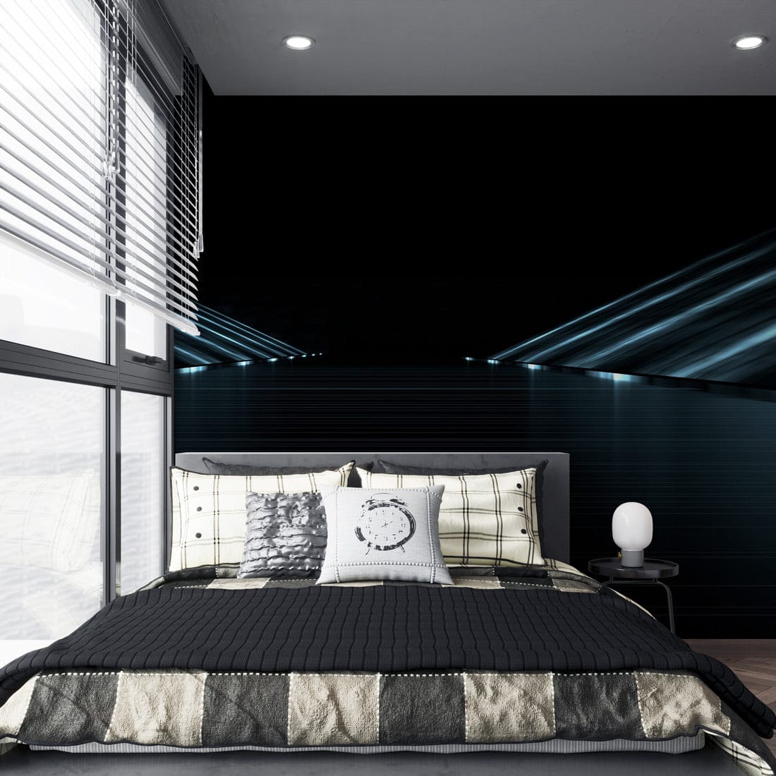 The Midnight Futuristic Horizon Mural Wallpaper offers a captivating visual journey into a sleek, digital realm. Its harmonious blend of deep blacks and luminous blues creates an enchanting atmosphere, capturing the essence of a distant horizon bathed in moonlight. This mural, inspired by modern artistry, seamlessly complements chic urban spaces, exuding both sophistication and timeless allure.