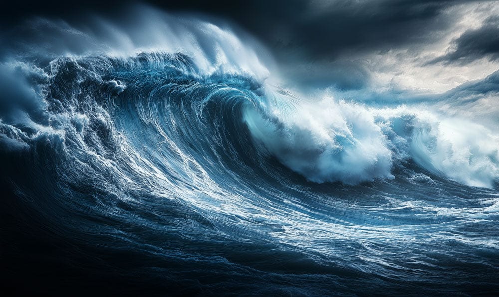 A powerful ocean wave rises beneath a dramatic, storm-lit sky, capturing the raw energy and movement of the sea at its peak. Deep blues and foaming highlights create striking contrast and depth, making the mural feel immersive and bold. This design brings intensity, strength, and a sense of awe to any interior space.