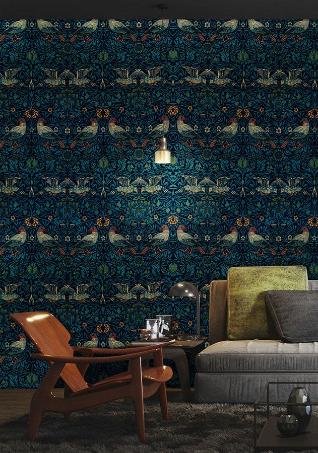 The Midnight Songbird Harmony Mural Wallpaper weaves a captivating tapestry of graceful birds and delicate florals against a rich, dark backdrop. This intricate design evokes a sense of serenity and elegance, perfect for creating a sophisticated ambiance. Its detailed artistry and textural depth make it a timeless addition to any space, appealing to those with a taste for the refined.