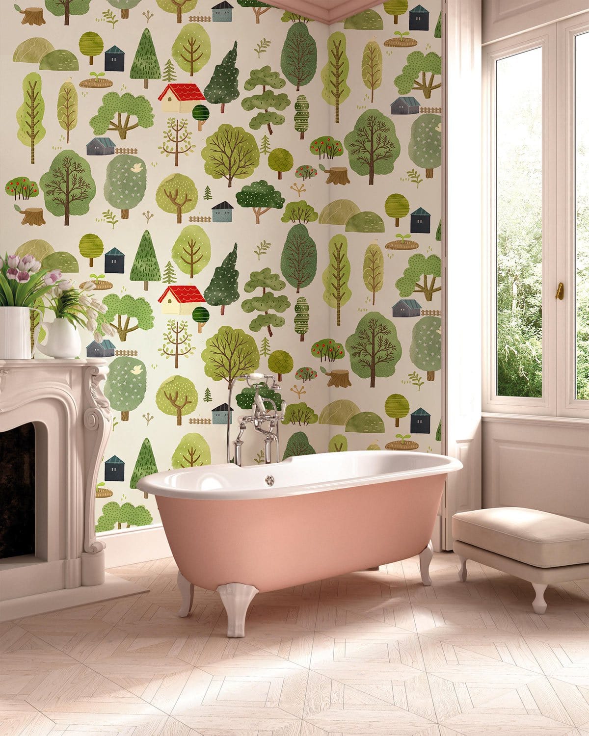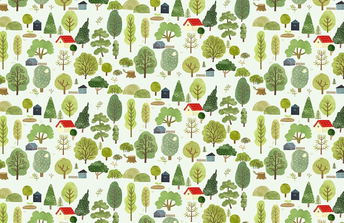 Immerse yourself in a whimsical woodland retreat with this Mini Cartoon Trees Wallpaper Mural. Featuring an enchanting array of stylised trees and cosy cottages, this design weaves a tapestry of intricate illustrations and delicate textures. The soft green palette, punctuated by charming hints of red and muted tones, evokes a serene yet playful atmosphere. Perfectly suited for varied settings from a child's nursery to a sophisticated study, each element of this mural harmonises to foster a calm and inviting ambience.