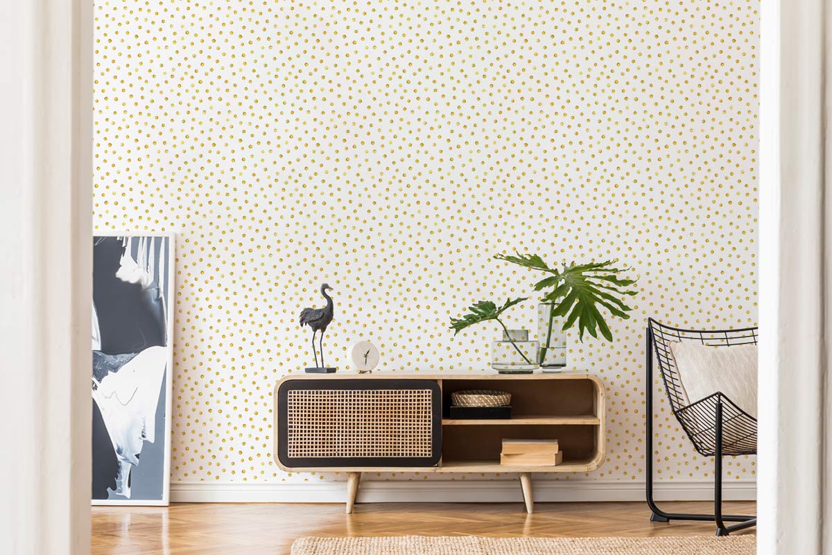 The Mini Gold Polka Dot Wallpaper Mural features a sophisticated arrangement of delicate gold dots against a crisp white backdrop, adding a touch of elegance and charm to any space. Its subtle texture and refined pattern exude a timeless appeal, effortlessly aligning with both classic and contemporary design aesthetics. Perfect for creating a serene atmosphere, this wallpaper is an ideal choice for those seeking understated luxury.