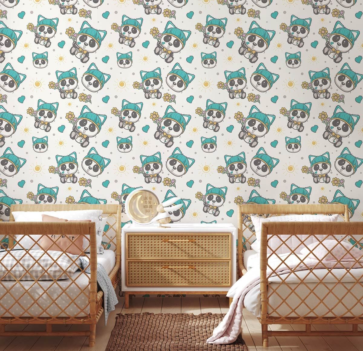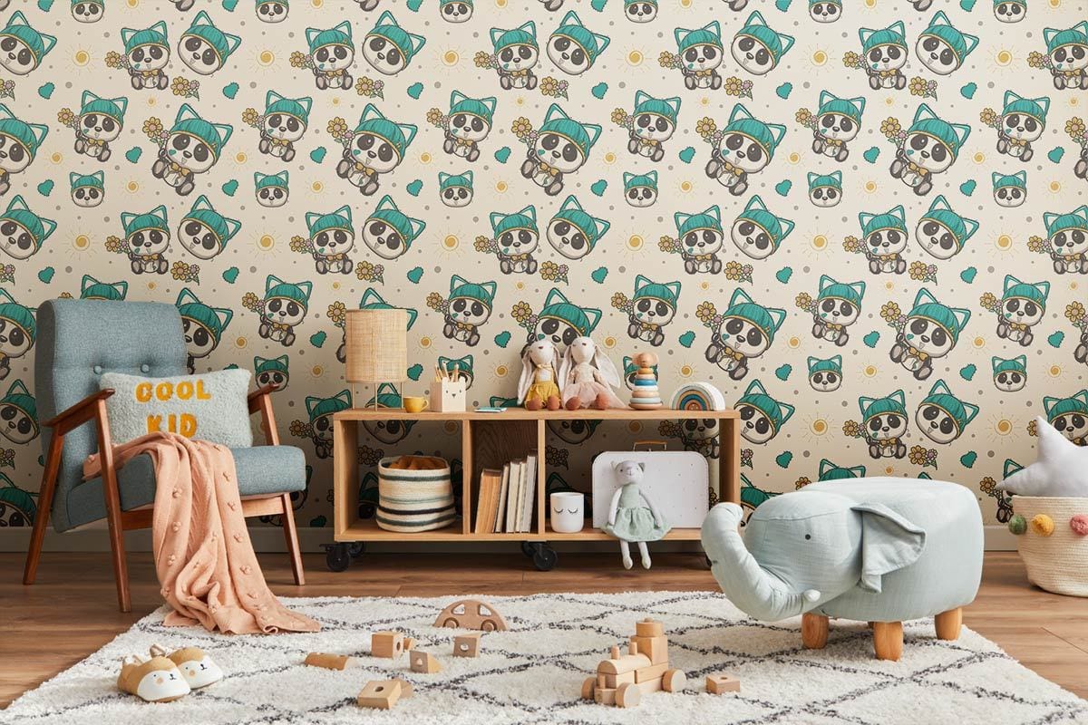 Discover a whimsical charm with the Mini Pandas Wallpaper Mural, featuring adorable pandas in a playful motif. The soothing tones of teal and cream meld seamlessly, creating an inviting backdrop that pairs beautifully with various design elements. Ideal for children's rooms or lively spaces, this wallpaper offers an artistic touch that exudes both warmth and elegance.