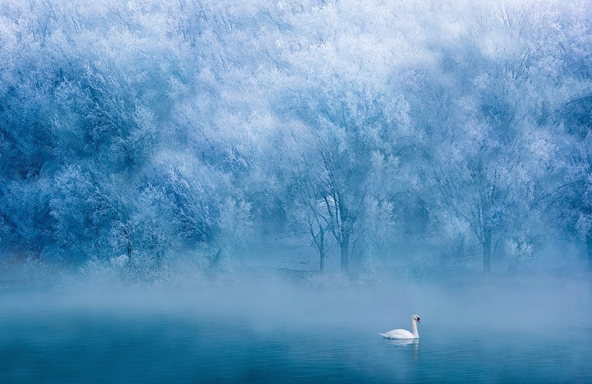 Immerse your space in the tranquil beauty of the Swan Lake Wallpaper Mural. This stunning design captures a serene winter landscape, featuring a lone swan gliding gracefully across misty waters, enveloped by ethereal frosted trees. The mural's delicate balance of soft, muted blues and whites creates a soothing atmosphere, infusing your room with a sense of calm sophistication. Perfect for adding a touch of elegance, this mural complements both traditional and contemporary interiors with its timeless artistry.