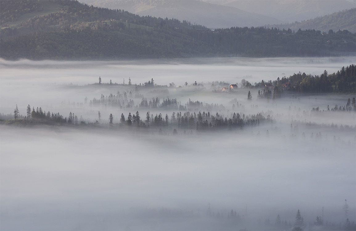 Immerse your space in the ethereal beauty of the Misty Forest Wallpaper Mural, where delicate wisps of fog weave through serene woodlands and rolling hills. This artistic masterpiece blends muted greys and verdant greens, providing a sophisticated backdrop reminiscent of tranquil mornings. Its intricate details evoke a sense of calm and introspection, making it a timeless choice that complements modern and bohemian interiors alike.