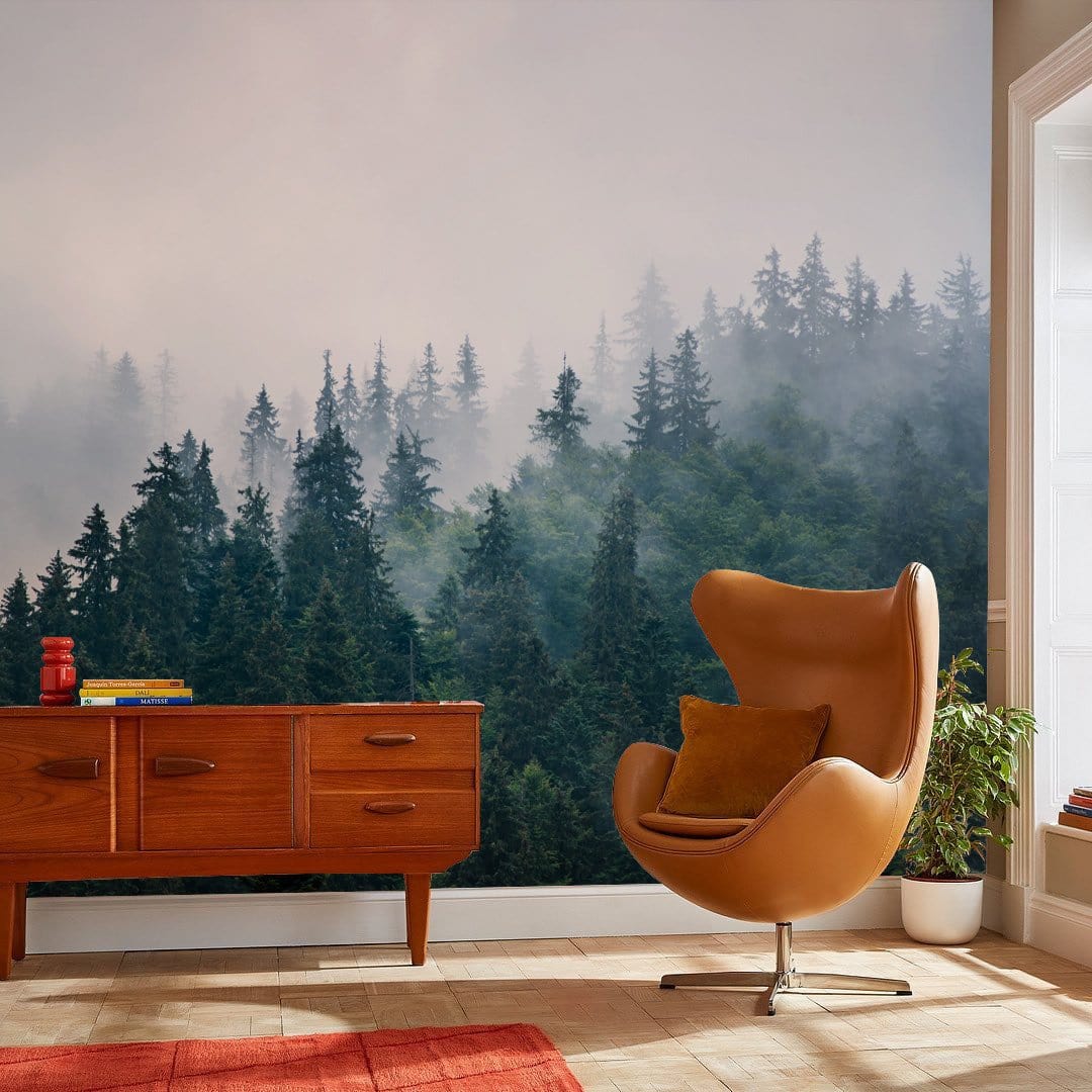 Immerse your space in the serene beauty of the Forest Mist Wallpaper Mural, which captures the ethereal embrace of mist-laden pines. Delicate greens blend with soft greys, creating a landscape that evokes quiet elegance and a moment of tranquillity perfect for any interior. Its artistic depth and fine detail make it a stunning backdrop for both contemporary and classic settings.