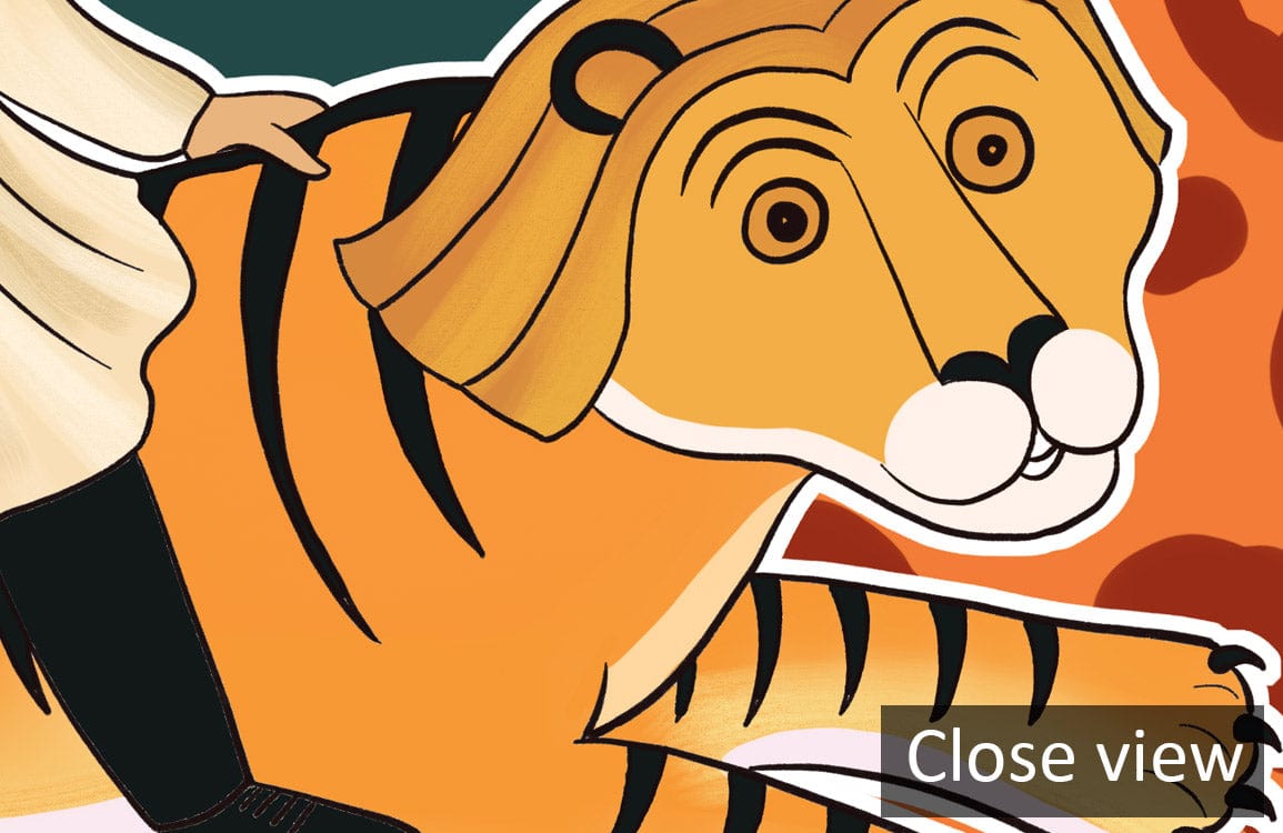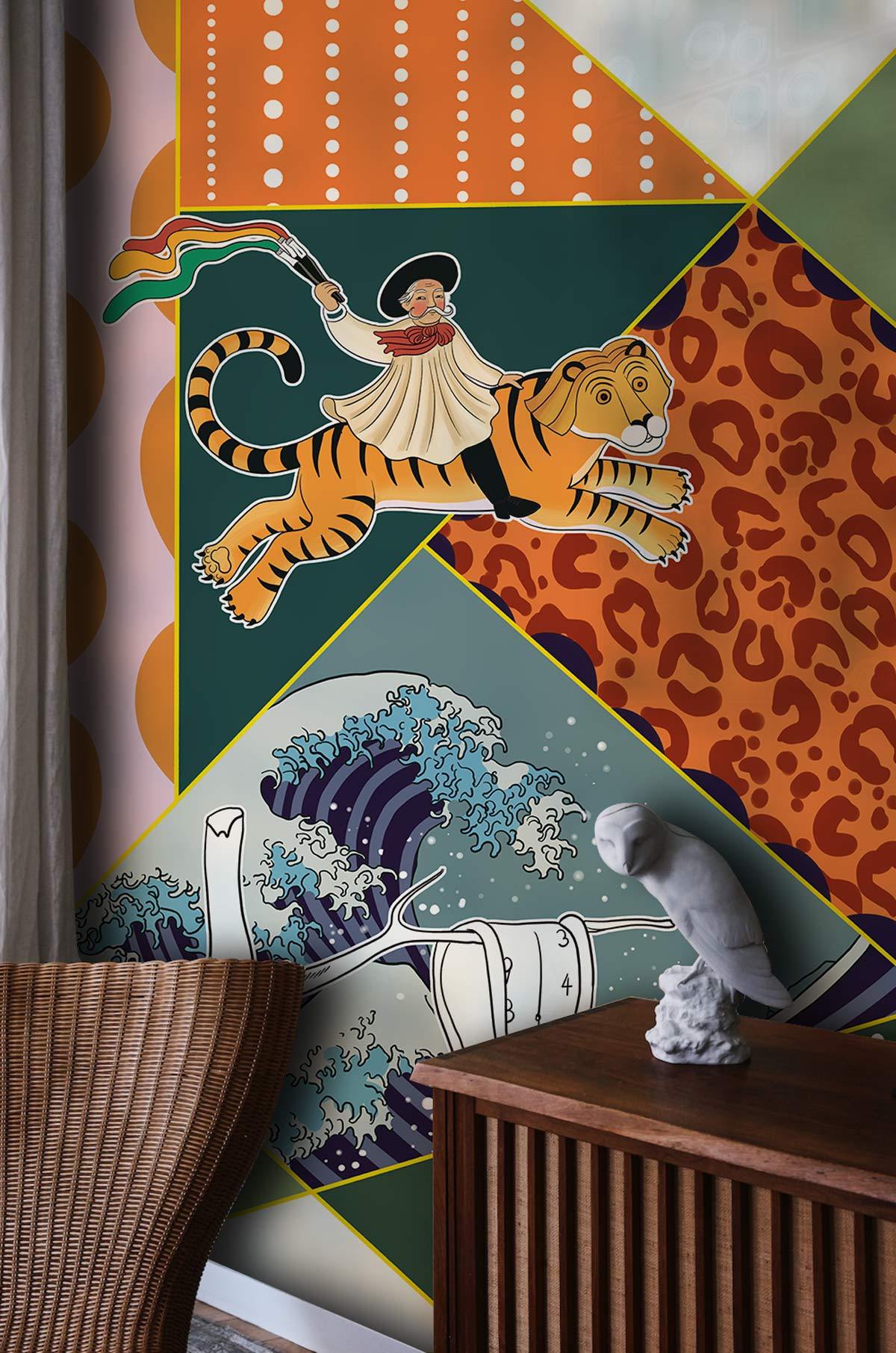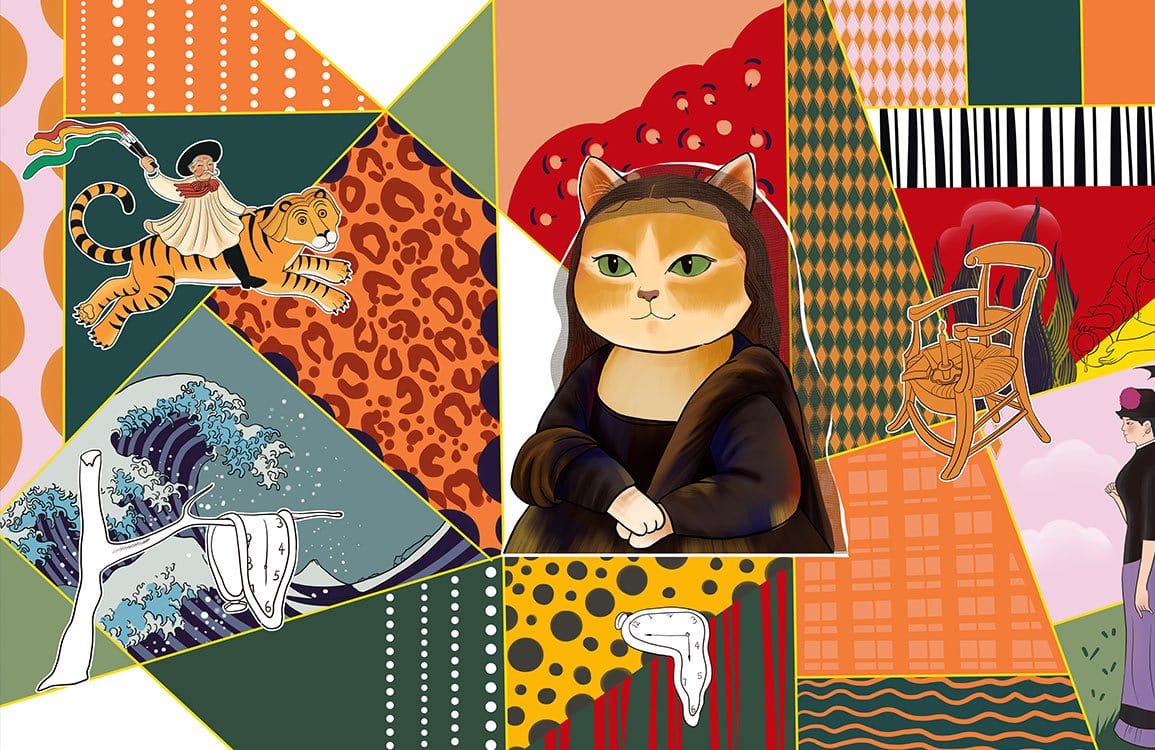 Immerse your space in eclectic charm with this Mixed Painting Wallpaper Mural. Featuring a tapestry of geometric patterns and whimsical figures, it evokes a conversation between art and decor. Rich tones dance with playful elements like a cat reminiscent of Mona Lisa, a classic tiger illustration, and hints of surrealism, offering a focal point that captivates and intrigues. Ideal for those seeking a backdrop that adds character and depth, this mural suits spaces yearning for an artistic touch.