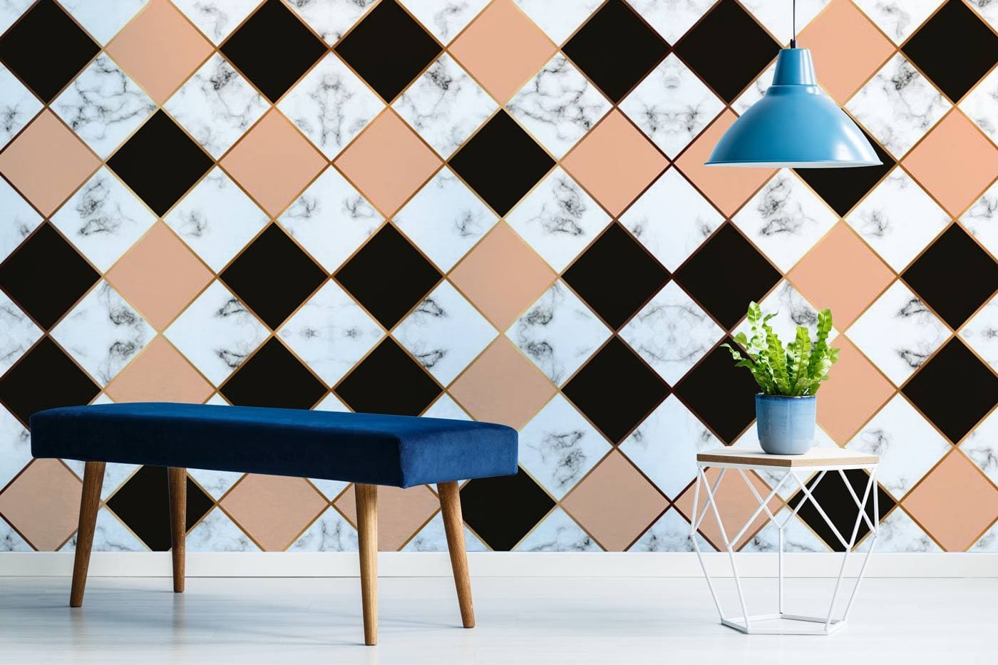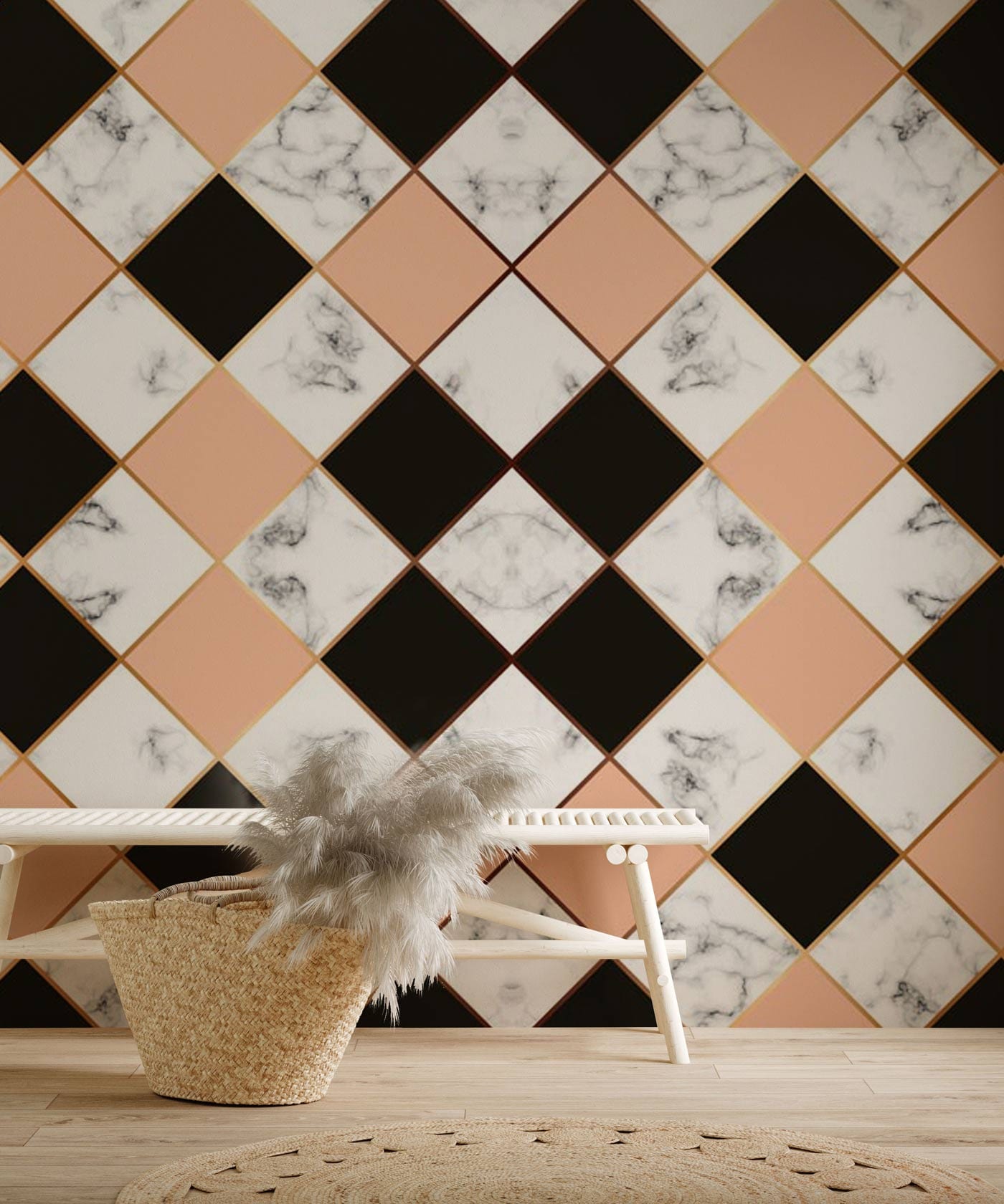 Elevate your space with the Mixed Marble Wallpaper Mural, featuring an exquisite harlequin pattern that combines the veined elegance of marble with accents of warm blush and deep black. Its geometric design interplays classical opulence with contemporary flair, making it ideal for diverse interiors.