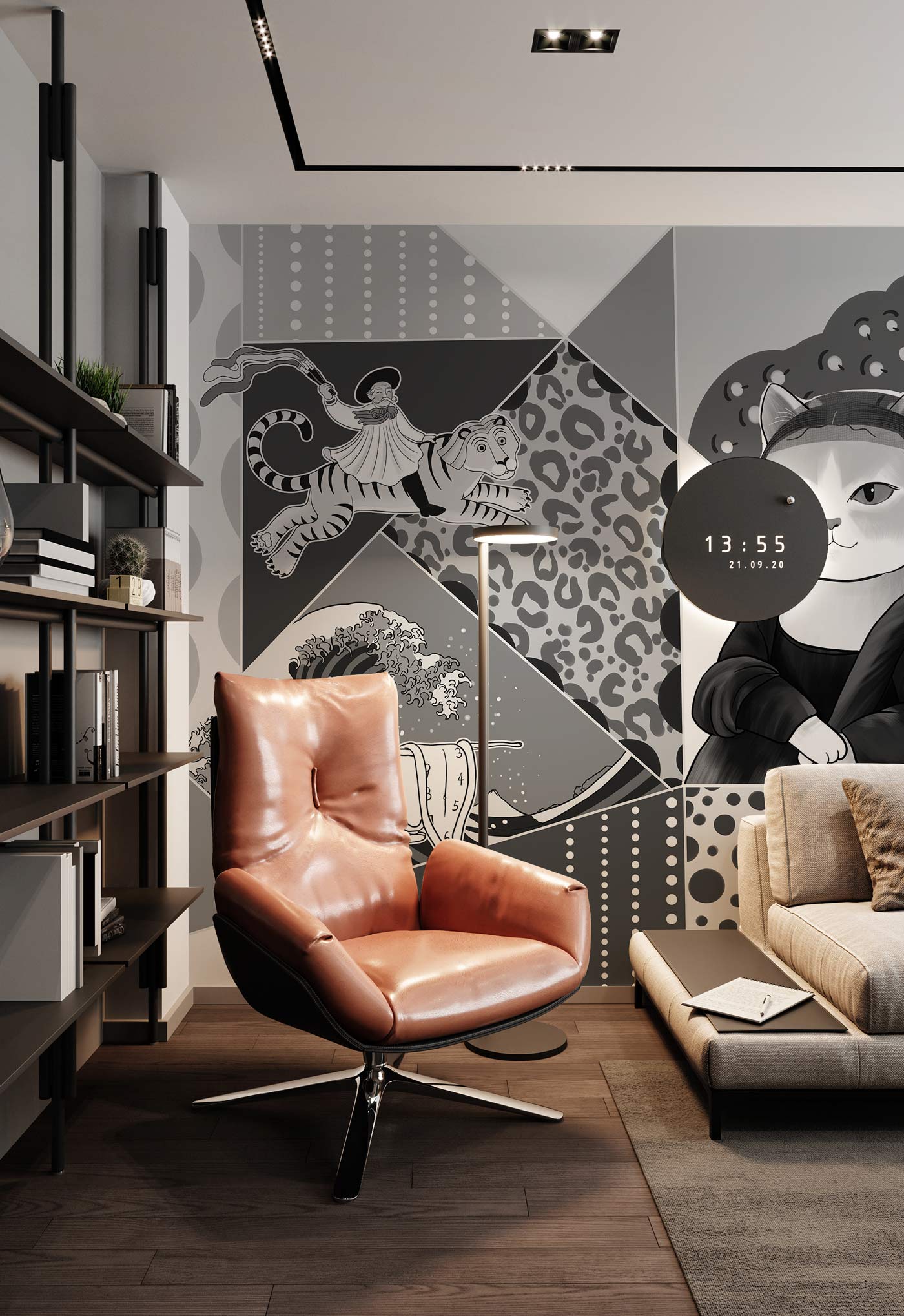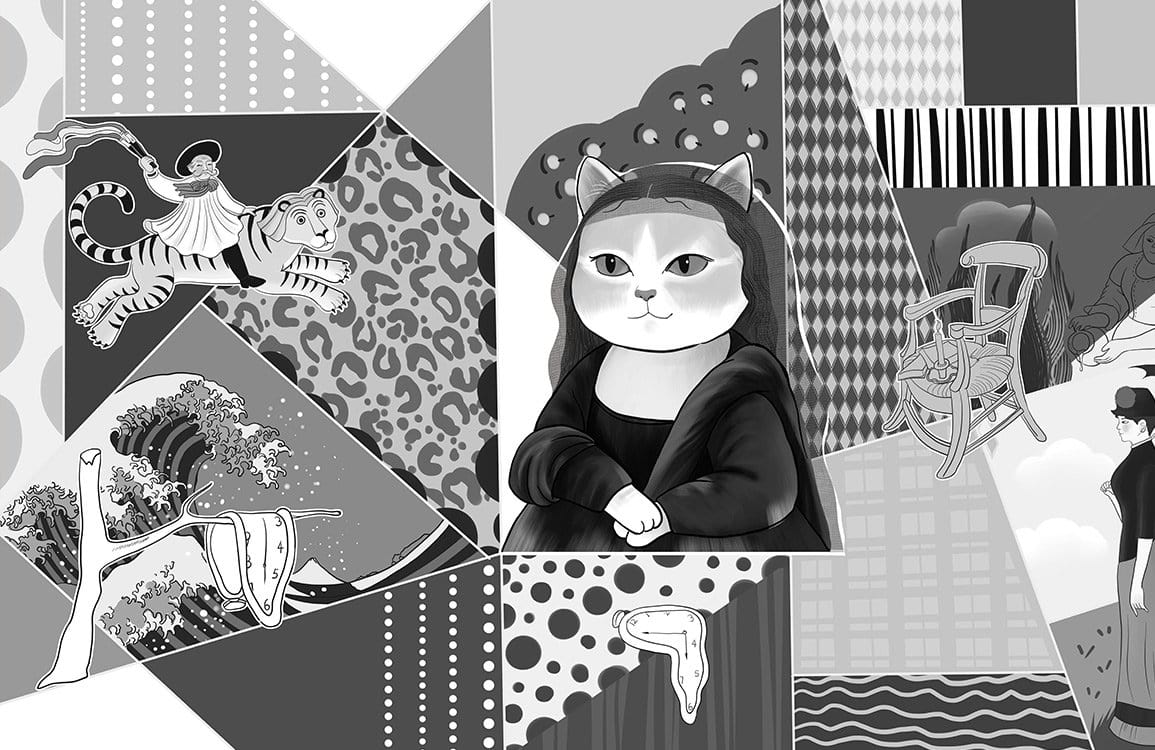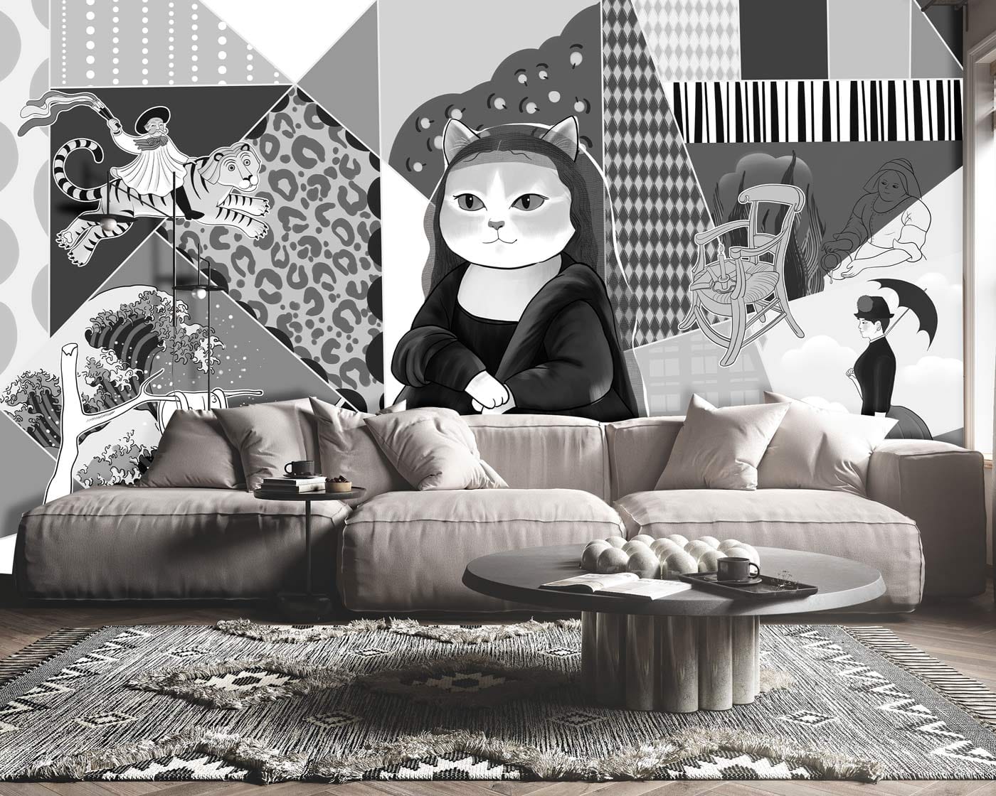 This Mixed Painting Wallpaper Mural blends eclectic artistry with a monochrome palette, featuring playful elements like whimsical creatures and classic motifs interwoven within geometric patterns. Its intricate design invites visual exploration, adding a layer of charm and complexity to any room, making it an exquisite choice for those who appreciate unique and sophisticated décor.