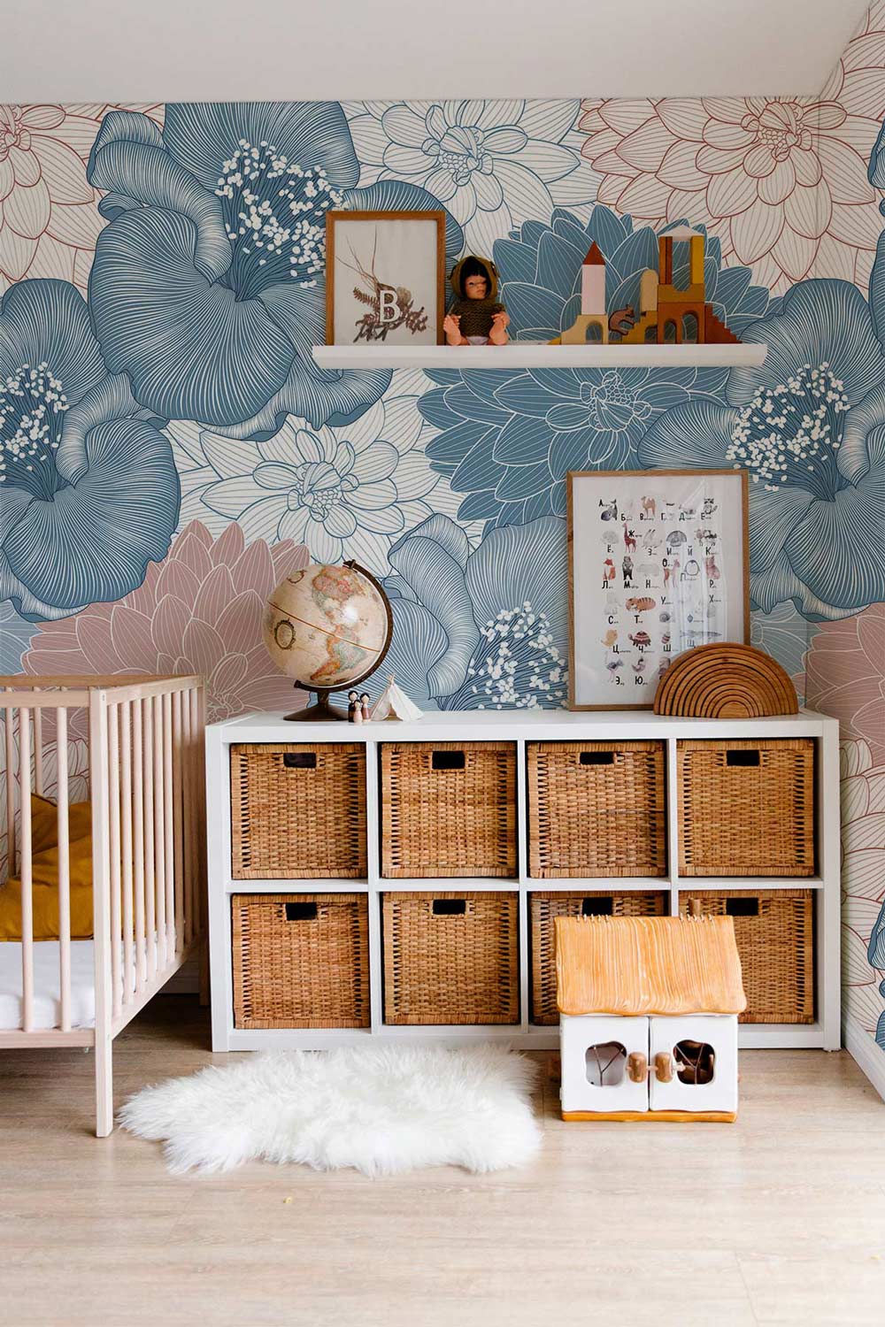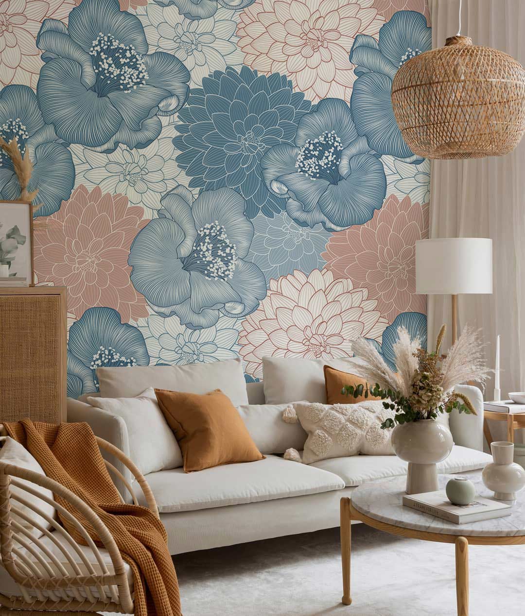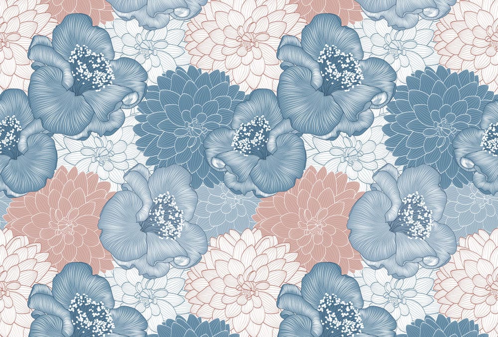 Take in the floral-inspired design of our Mixture Blossom Wallpaper Mural into your home! It features a minimalist drawings of various flowers and leaving blooming in the middle of the summer. With its intricate patterns and lush blue, blush pink, and glowing white colour palette, this beautiful flower wallpaper will create a sense of enchantment to your living space. This fresh, contemporary layout makes a bold statement that's sure to brighten up your hallways, dorm rooms, and apartments.