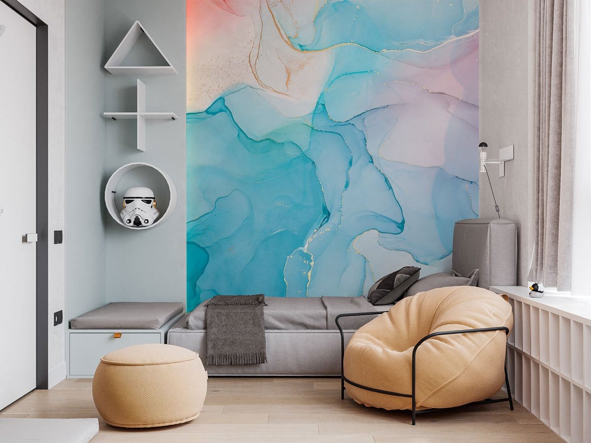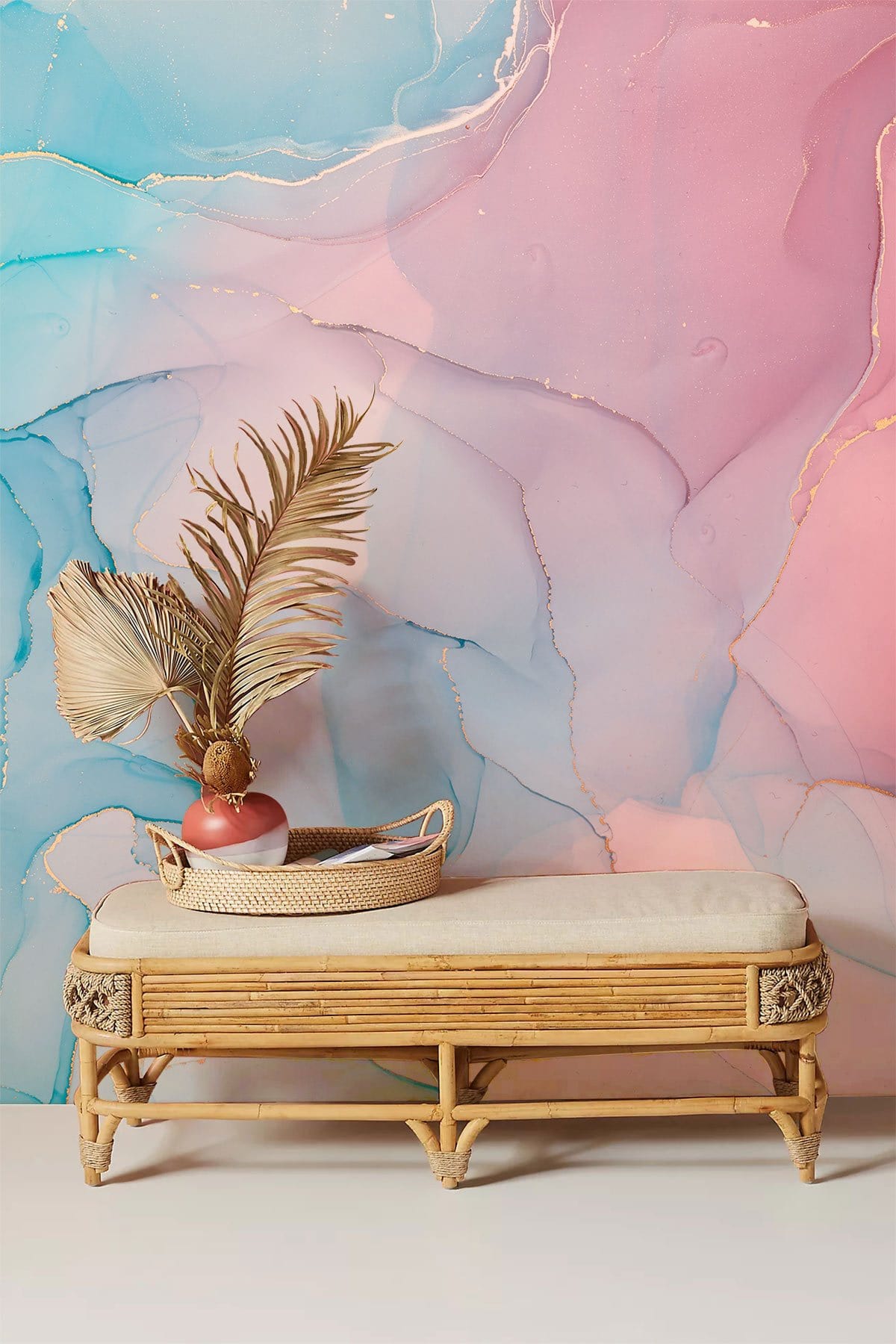 Sleek, pretty and ultra-modern, this stylish Blue & Pink Swirl marble wallpaper will make the most perfect marble feature wall in any room! Bring out those subtle blues and pinks by choosing decor in similar pastel tones. And don't forget those golden colours by choosing lighting and furniture with brass and gold tones.