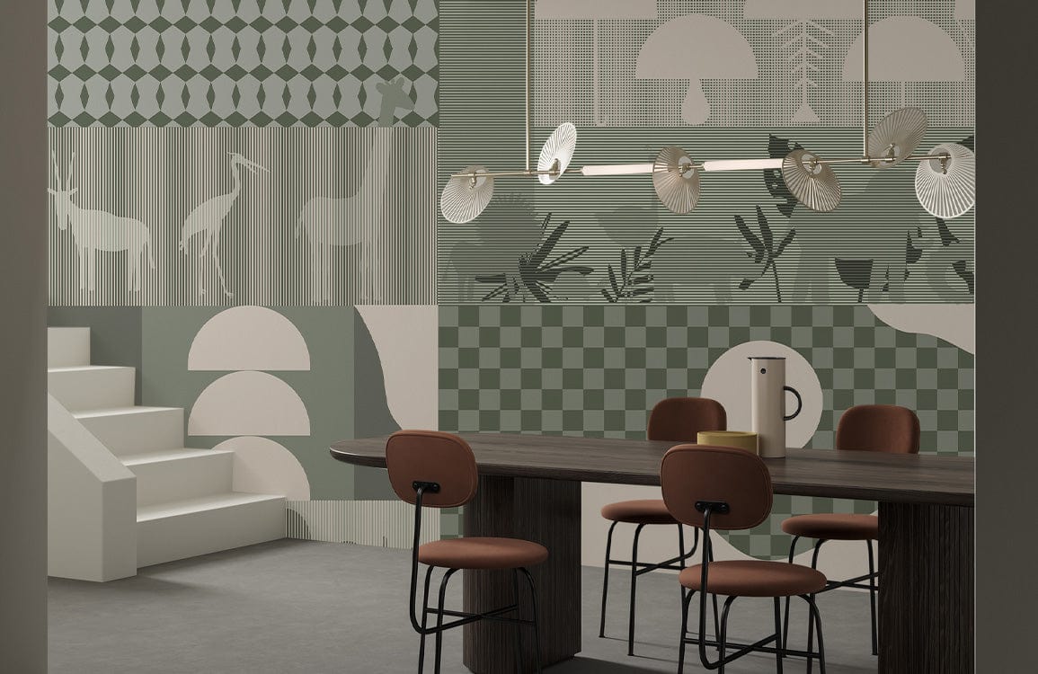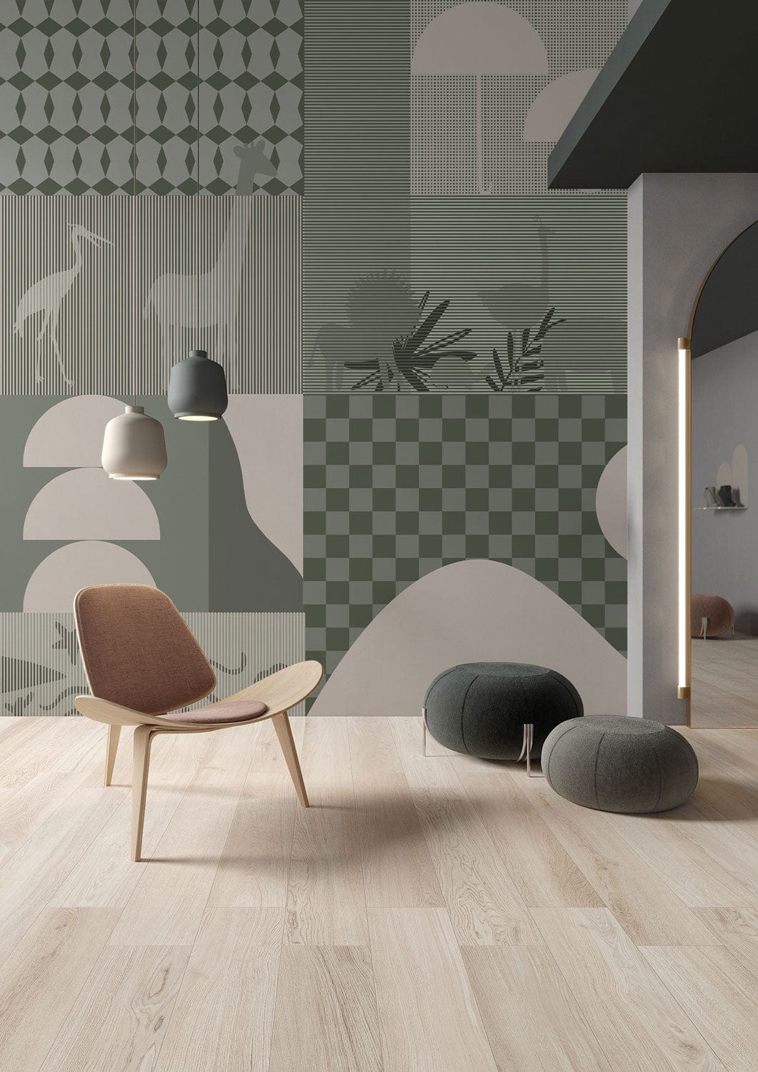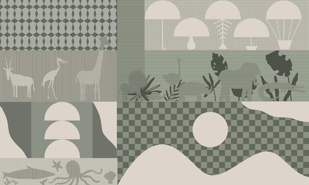 This Modern Bauhaus Geometric Wallpaper captivates with its artistic interplay of abstract shapes, wildlife silhouettes, and intricate patterns. Its subtle harmony of muted tones creates a sophisticated and timeless atmosphere, seamlessly integrating into any contemporary or retro-inspired interior. Perfect for adding a touch of creative depth, the wallpaper transforms walls into a canvas of elegant serenity, inviting a sense of balance and artistry into your home.