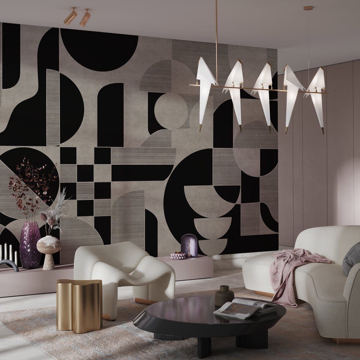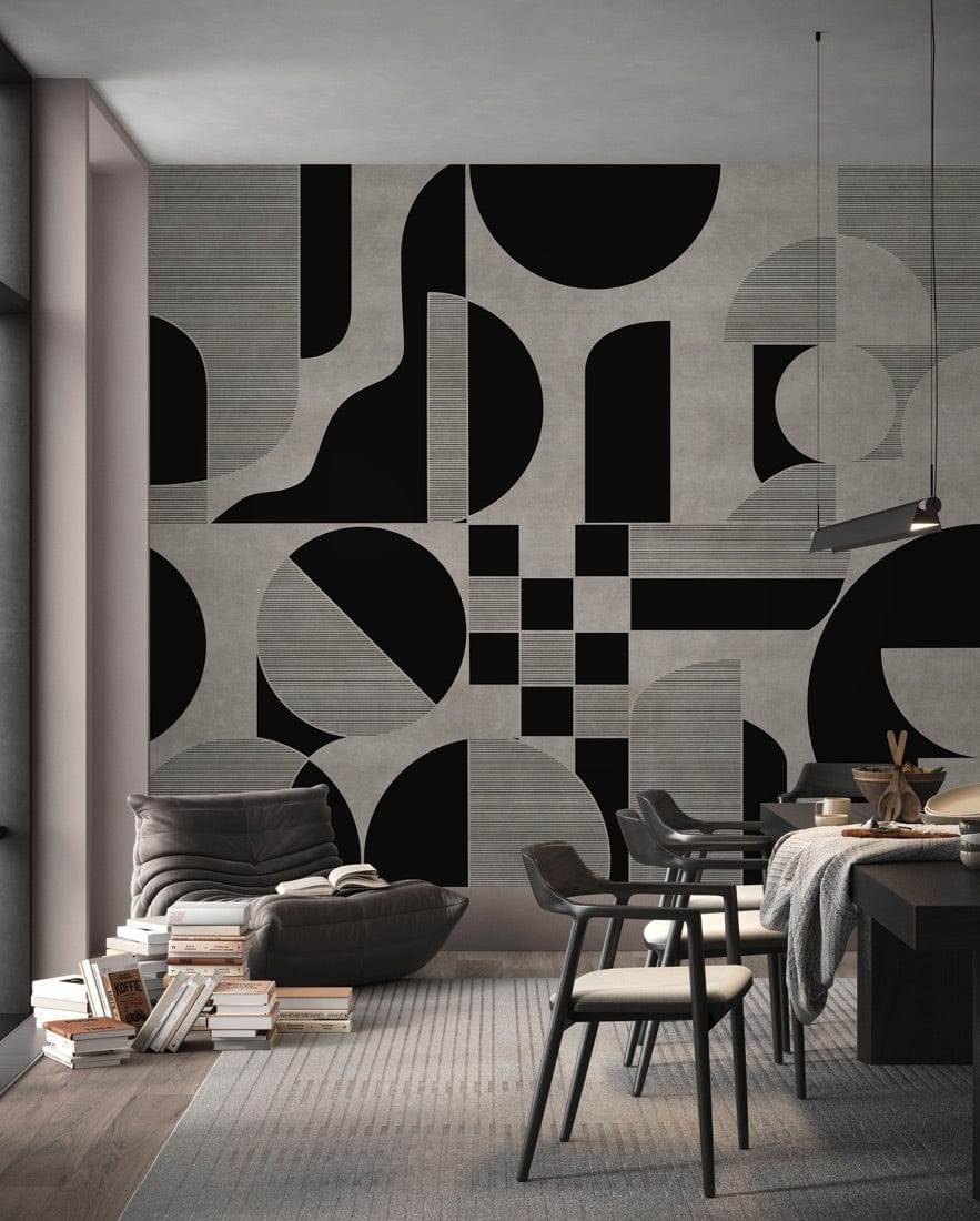 This Modern Geometric Contrast Mural Wallpaper brings a compelling blend of art and precision to your space. With its striking interplay of shapes and textures, the design creates a visually stunning backdrop. The harmonious balance of curves and lines in muted monochrome tones imparts a sophisticated elegance. Perfect for elevating the ambience of contemporary environments, it adds a subtle yet captivating layer to your interior design.