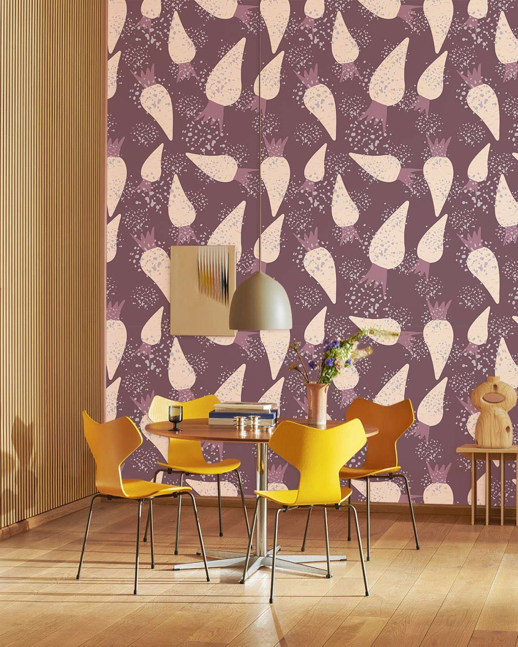 Modern Radish Root Pattern Mural will instantly transform any space in your house. This mural wallpaper is a lively and imaginative way to bring some life and personality to any area by combining additional colours of purple and white for interior design inspiration. It's the ideal complement to any office or classroom with a modern style that's sure to wow. Who'd have guessed the humble radish could be transformed into such a stunning piece of furniture?