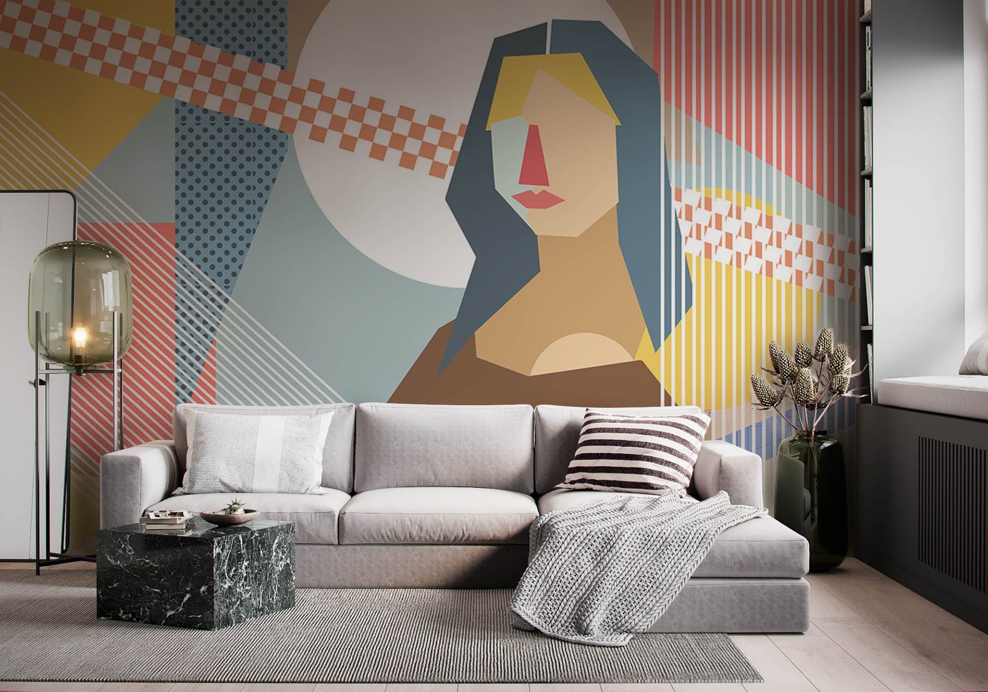 Create an eye-catching space with this Monalisa portrait wallpaper mural. The abstract illustration of Famous Monalisa portrait perfectly blend with geometric figures that add a more contemporary feeling to the art work. Ideal wall mural to pair with your modern furniture and home decors.