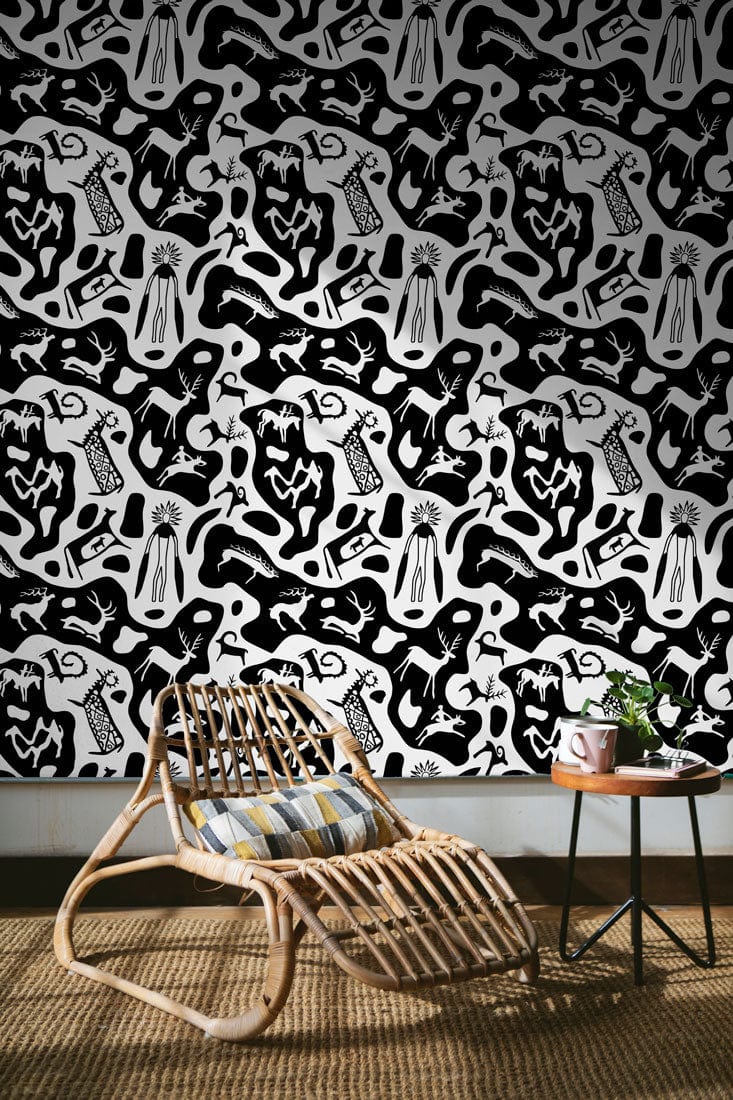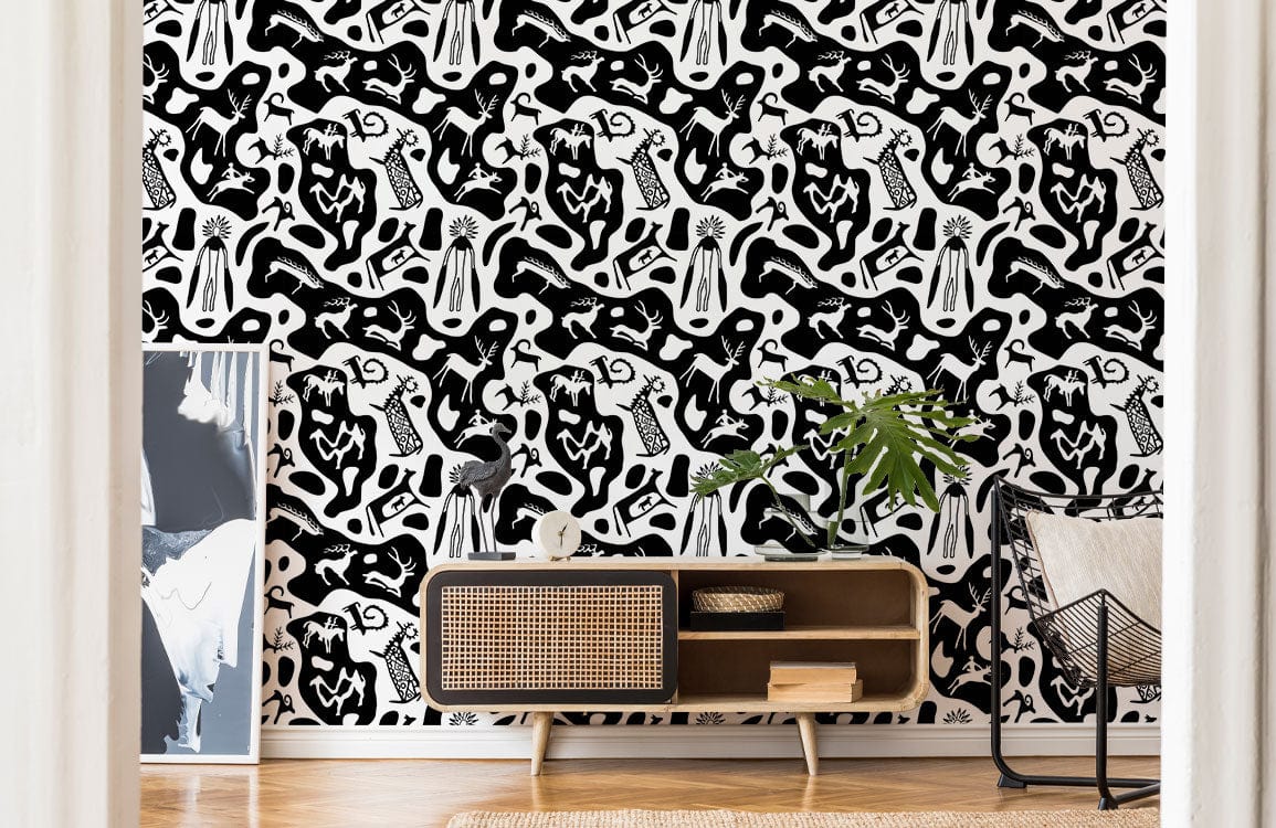 Immerse your space in a tapestry of artistic flair with the Monochrome Tribal Symphony Mural Wallpaper. This striking design features an intricate blend of tribal patterns and abstract forms, brought to life in a sophisticated monochrome palette. The synergy between its dynamic shapes and subtle textures creates a timeless appeal that complements an array of interior styles, seamlessly fitting into both contemporary and classic settings.