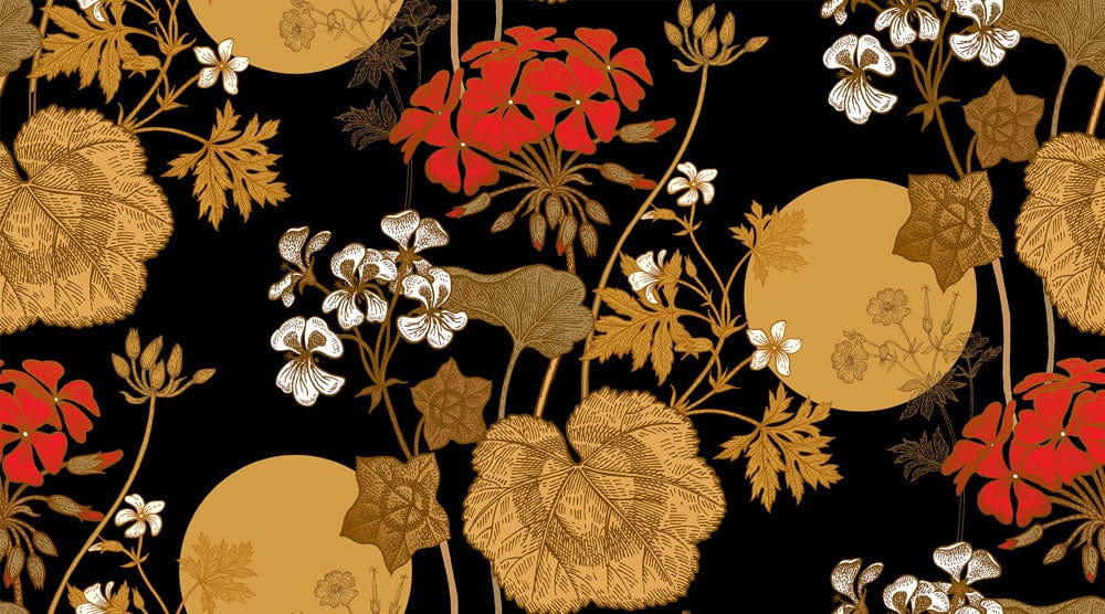 A gorgeous wallpaper featuring colourful flowers on a black background, our Moon and Flower Wallpaper Mural is a bright and vivid addition to your living space. Adding a touch of glamor to your walls, this elegant, golden flower-patterned wallpaper will create a luxurious area that you'll want to be in all the time, especially with its bold red blossoms, fresh golden leaves, and bright shining moon. This design is good for offices, kitchens, and other workspaces.