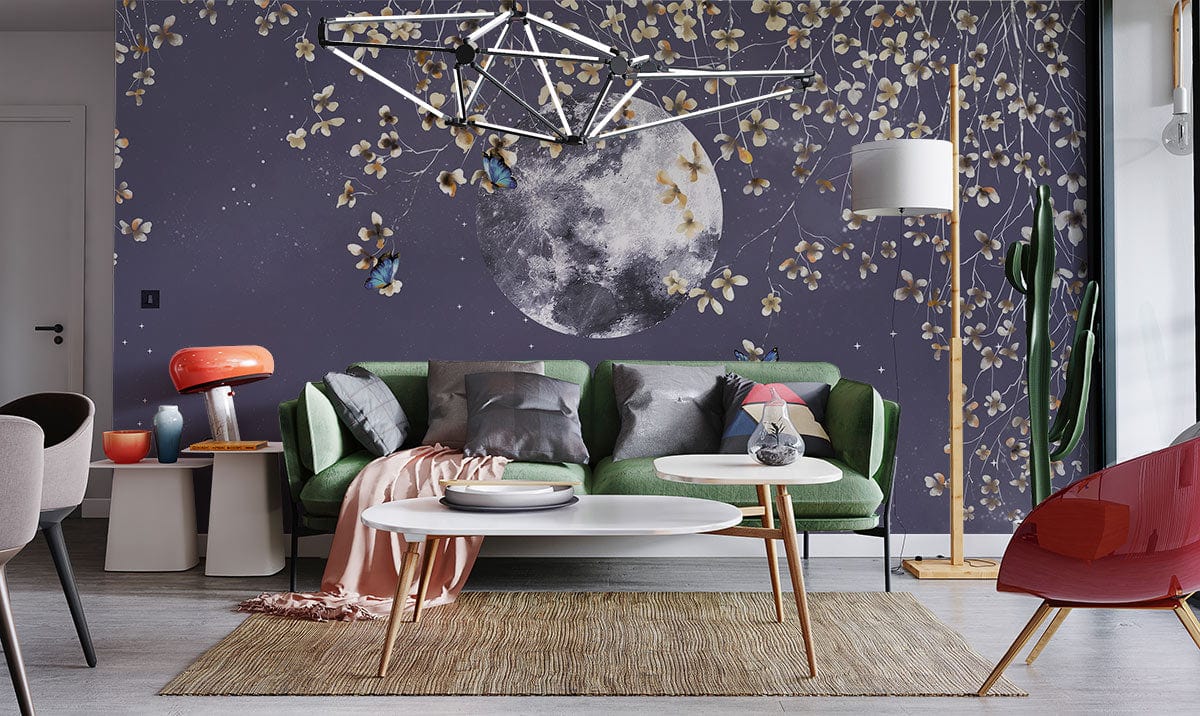Stunningly beautiful and filled with colour, our Moon Night View Mural Wallpaper is a great addition to any room. With the realistic image of a nearby view of the moon at night, this mural will turn your bedroom or living area into a celestial space. Perfect for a star-gazing wall, this wallpaper features a stunning night sky with a full moon and all the characters of a perfect evening: twinkling stars, lively flowers, and shimmering butterflies. Whether light or dark, it has a low luster that will not compete with other decorative items in a room.