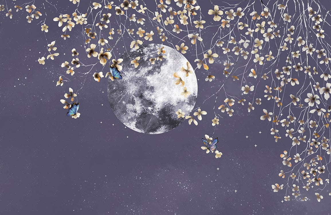 Immerse your space in a serene nocturnal allure with the Moon Night View Wallpaper Mural. This exquisite design features a luminous full moon enveloped by delicate floral branches and fluttering butterflies, set against a deep, star-studded sky. The intricate details and rich textures create a sense of depth and tranquillity, making it a refined choice for both classic and contemporary interiors.