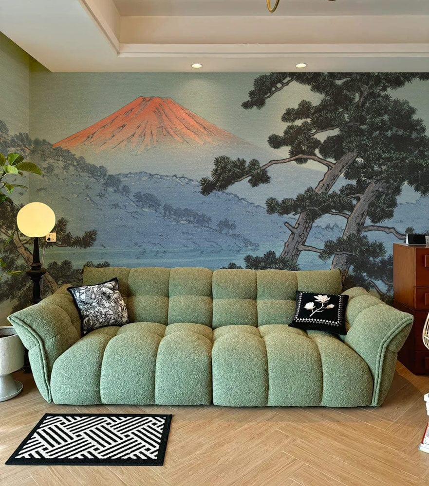 Delight in the exquisite artistry of the Mount Fuji Pine Landscape Mural Wallpaper, where verdant pines frame the majestic silhouette of Mount Fuji, kissed by a sumptuous sunset. This mural elegantly weaves together serene nature with iconic imagery, creating an ambient tapestry that speaks of tranquillity and natural beauty. Ideal for spaces that seek a touch of refined elegance, its intricate details and gentle hues complement both modern and traditional settings.