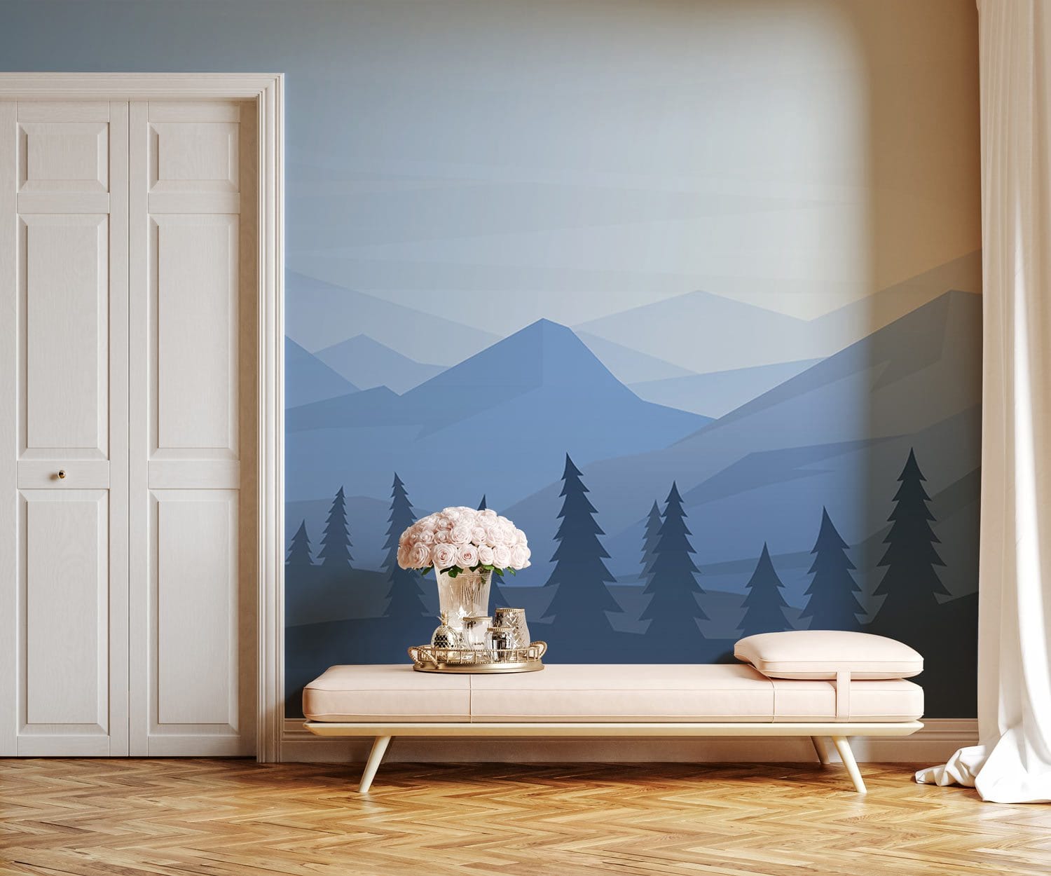 Embrace the serene beauty of nature with our Mountain Forest Wallpaper Mural, which gracefully blends layers of majestic blue mountains and lush, shadowed evergreens. This artistic depiction, with its soothing gradients and minimalist design, instils a sense of depth and tranquillity. Perfect for creating a sophisticated atmosphere, it adapts effortlessly to various interior styles, offering a delightful escape into the wilderness.
