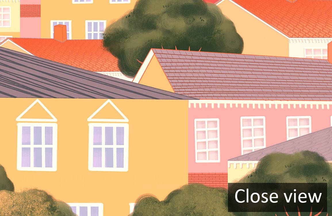 Our hand-drawn house portrait mountain village wallpaper mural is ready to welcome you home as our new accent wall. Whether you picture this wallpaper sitting in your living room or hallway, it will add a touch of architectural style and refresh your space. Pair this design with any style of furniture to level up your rooms.