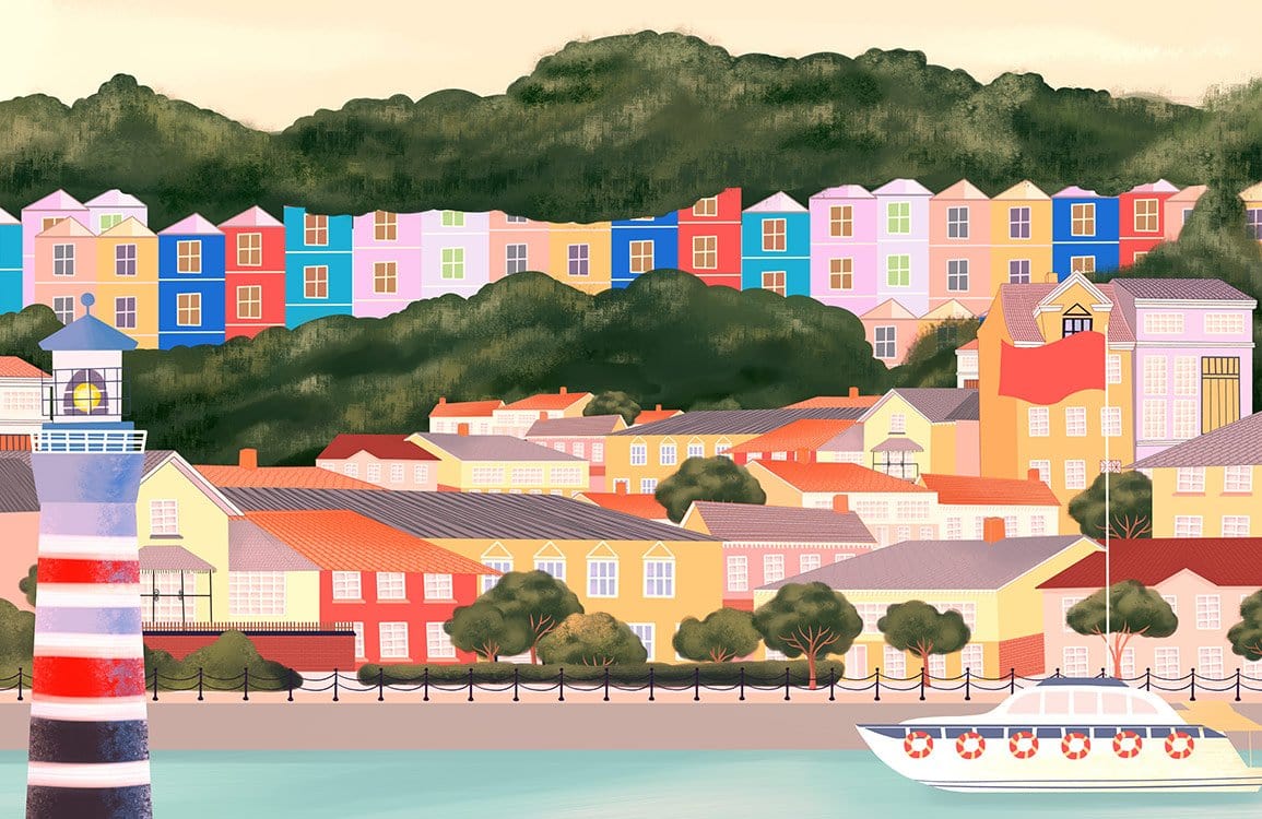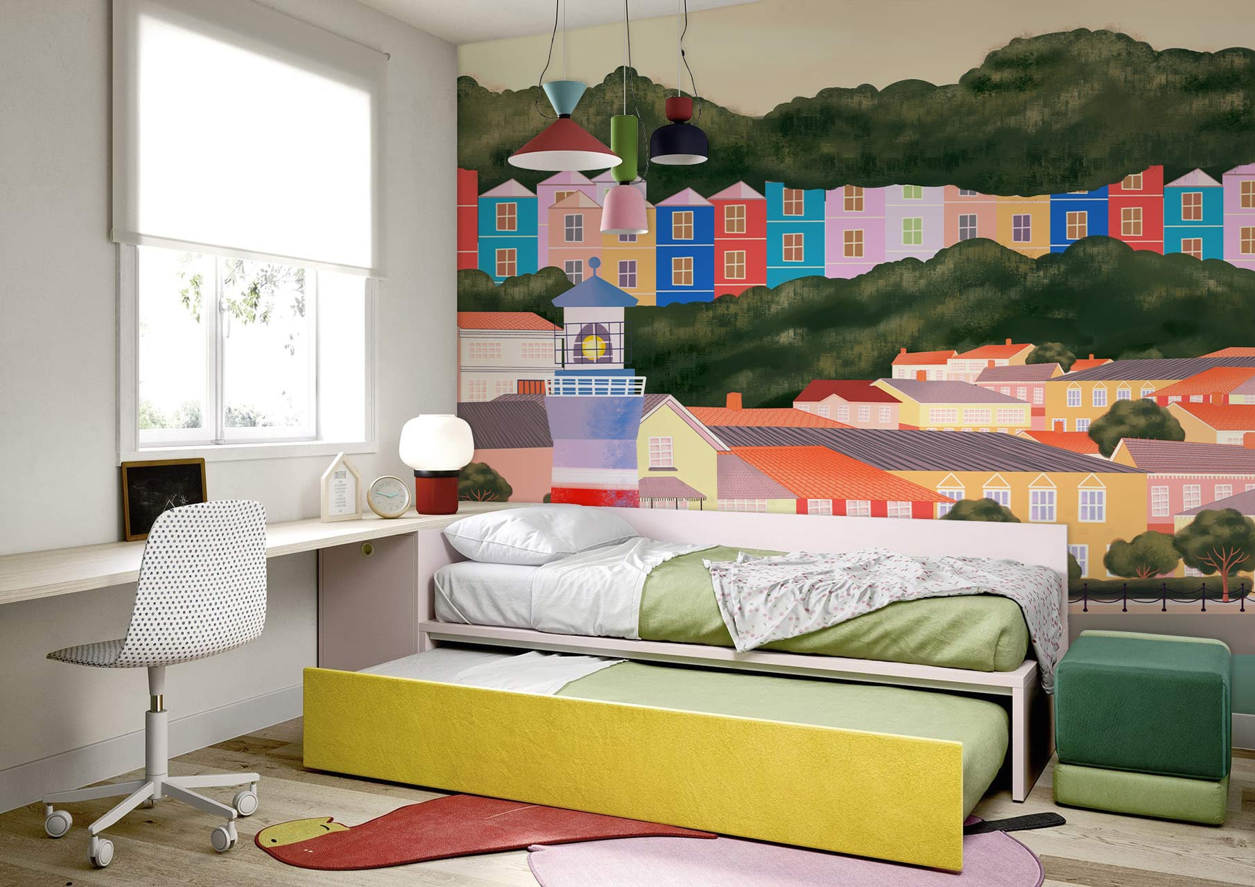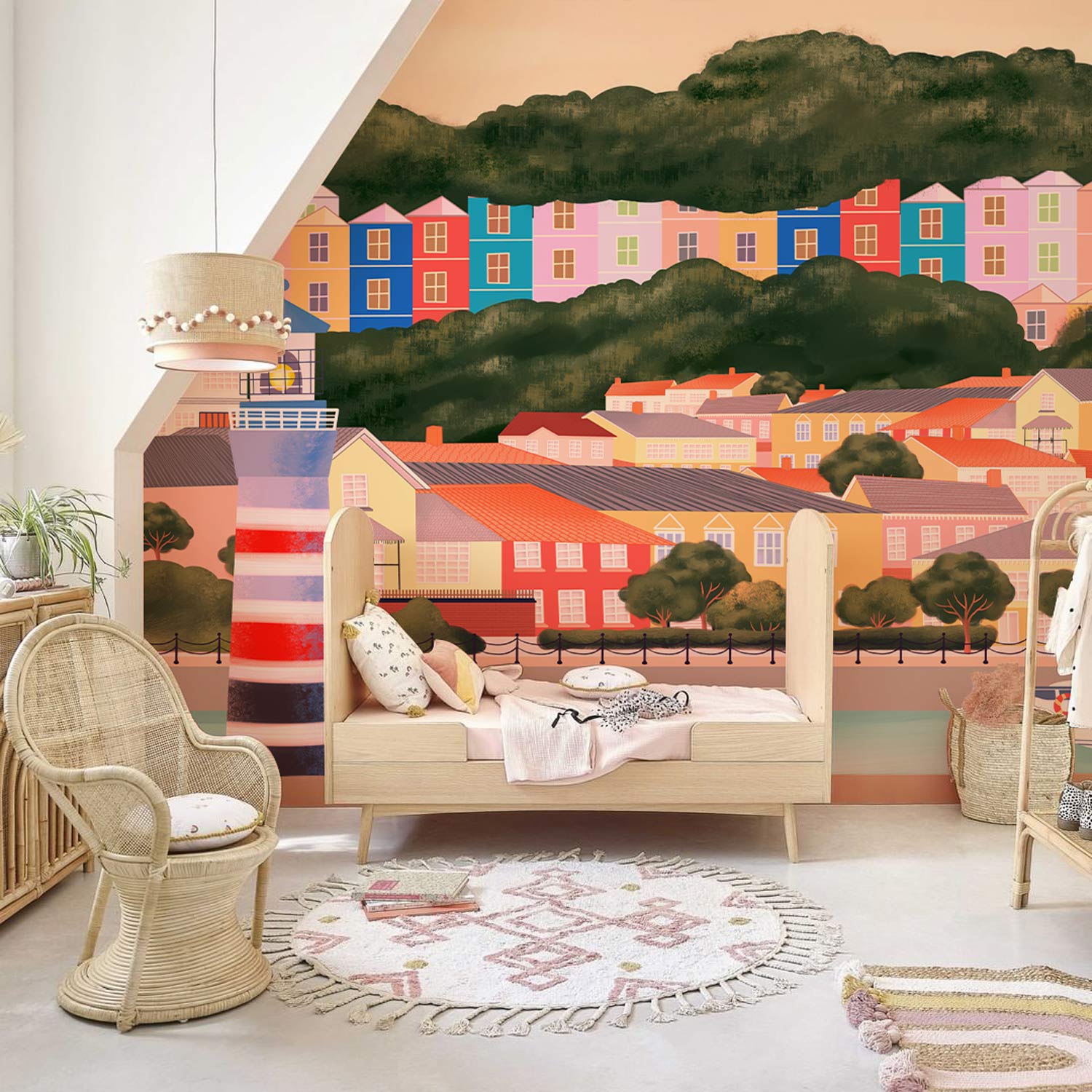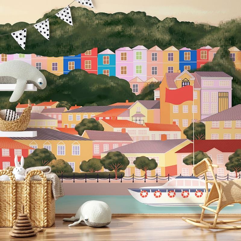 Mountain Village II Wallpaper Mural evokes the charm of a quaint coastal town where pastel-coloured houses nestle against verdant hills. The mural's artistic detail captures a picturesque scene with a serene waterfront, inviting viewers to linger in its calming ambience. Perfectly suited for a variety of settings, this mural brings a sophisticated yet whimsical touch to any space, offering a visual escape to peaceful village life.