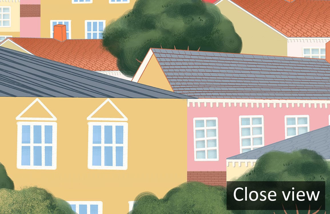 Our hand-drawn house portrait mountain village wallpaper mural is ready to welcome you home as our new accent wall. Whether you picture this wallpaper sitting in your living room or hallway, it will add a touch of architectural style and refresh your space. Pair this design with any style of furniture to level up your rooms.