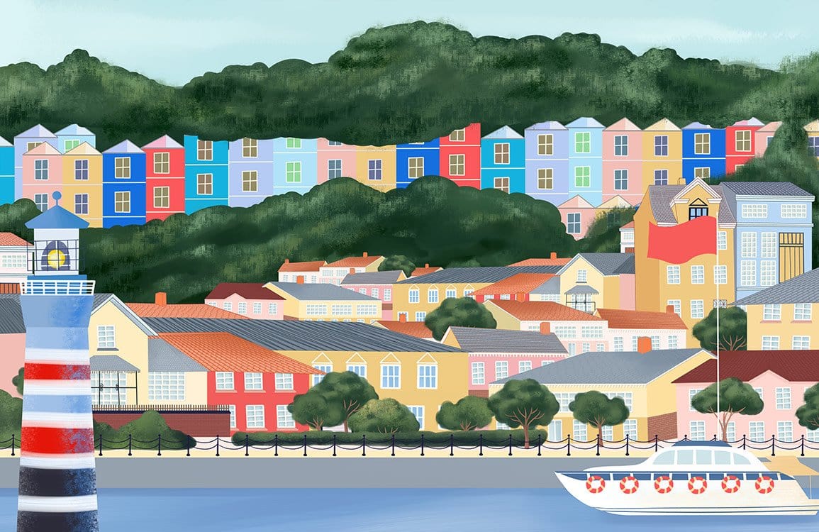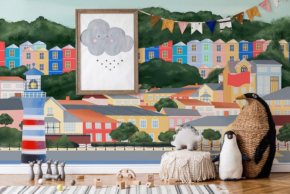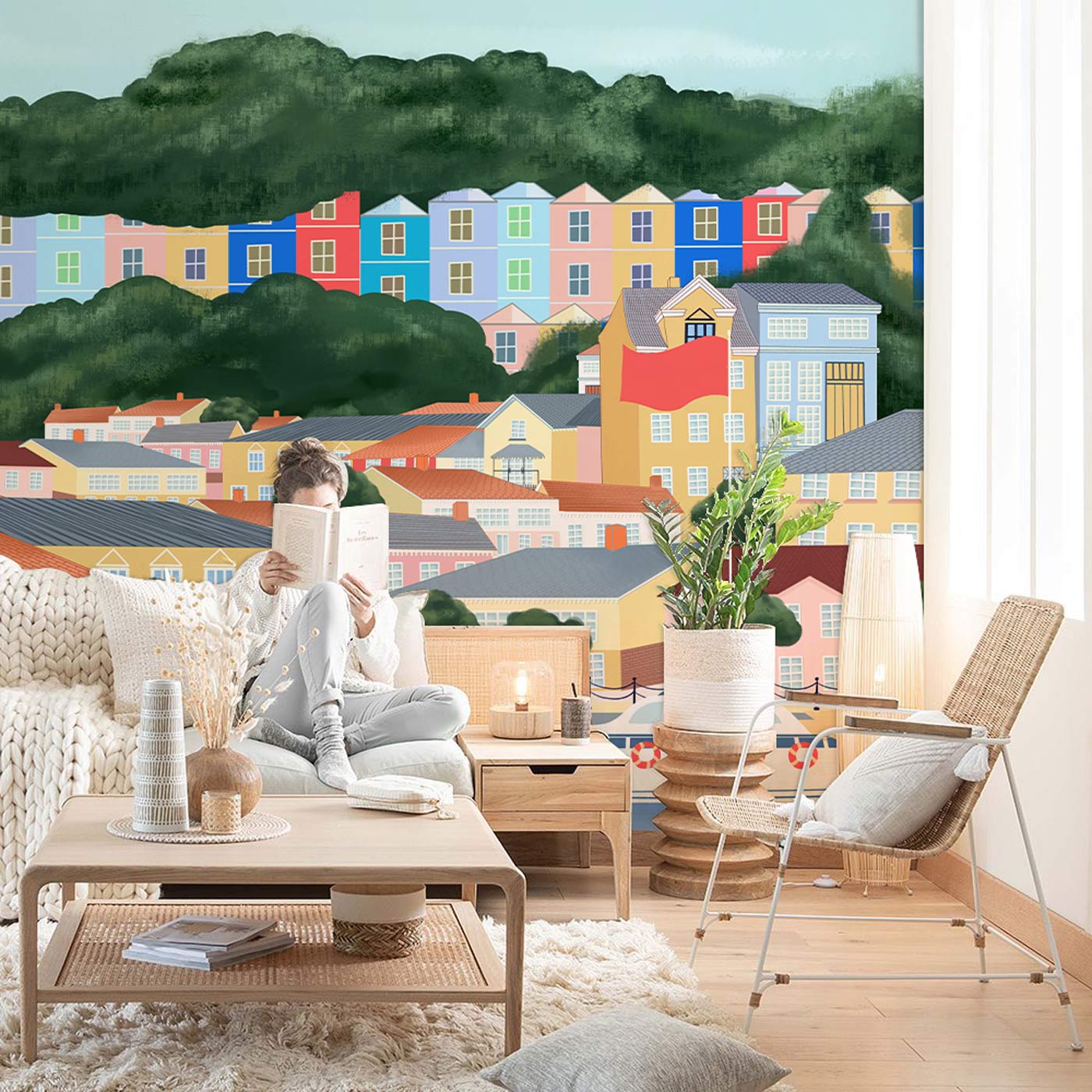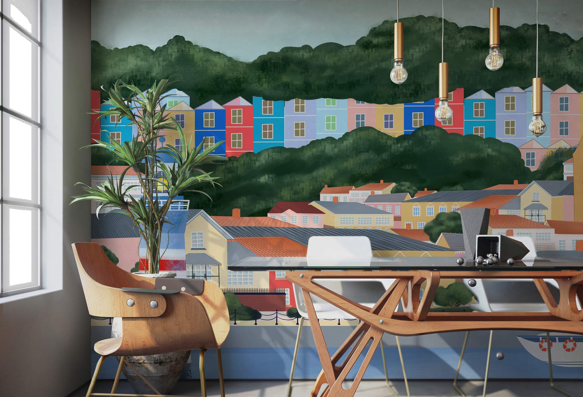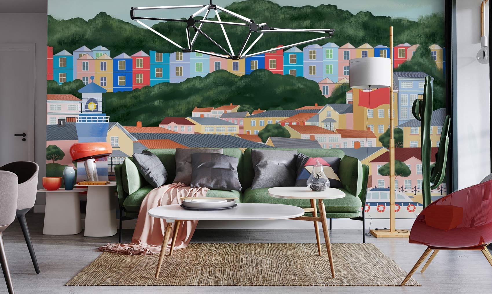 Immerse your space in the tranquil charm of the Mountain Village Wallpaper Mural, where rows of pastel-hued houses rest along green, wooded hills. The mural's intricate details capture the essence of serene coastal living, with a scenic lighthouse and a tranquil harbour, offering a picturesque ambience. This wall art seamlessly infuses any room with a sophisticated blend of natural beauty and village allure, making it an exquisite backdrop for varied interior styles.