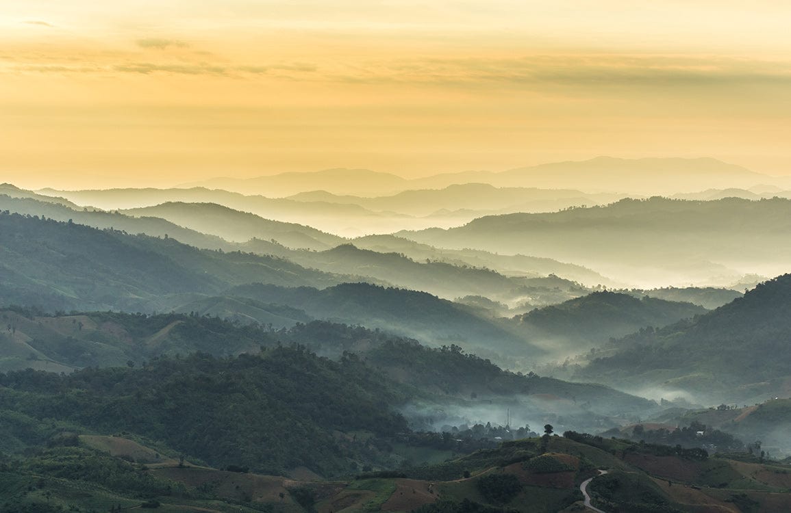 Capturing the serene beauty of distant mountains under a golden sky, this wallpaper mural infuses spaces with a tranquil and sophisticated atmosphere. The delicate interplay of soft yellow and deep greens evokes a sense of timeless elegance, seamlessly blending with classic or contemporary interiors. Perfect for creating a contemplative focal point, its intricate details and natural textures invite a soothing outdoor aesthetic into any room.