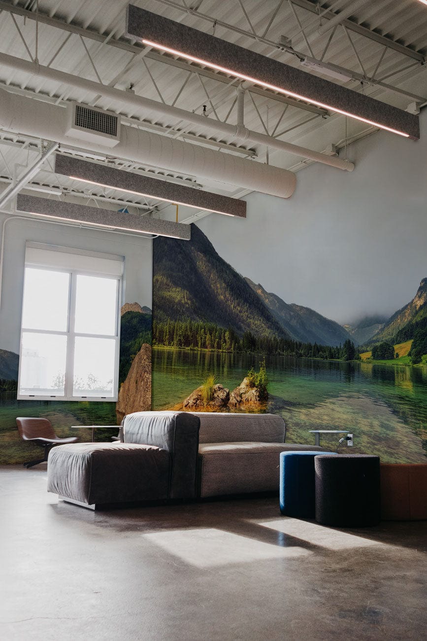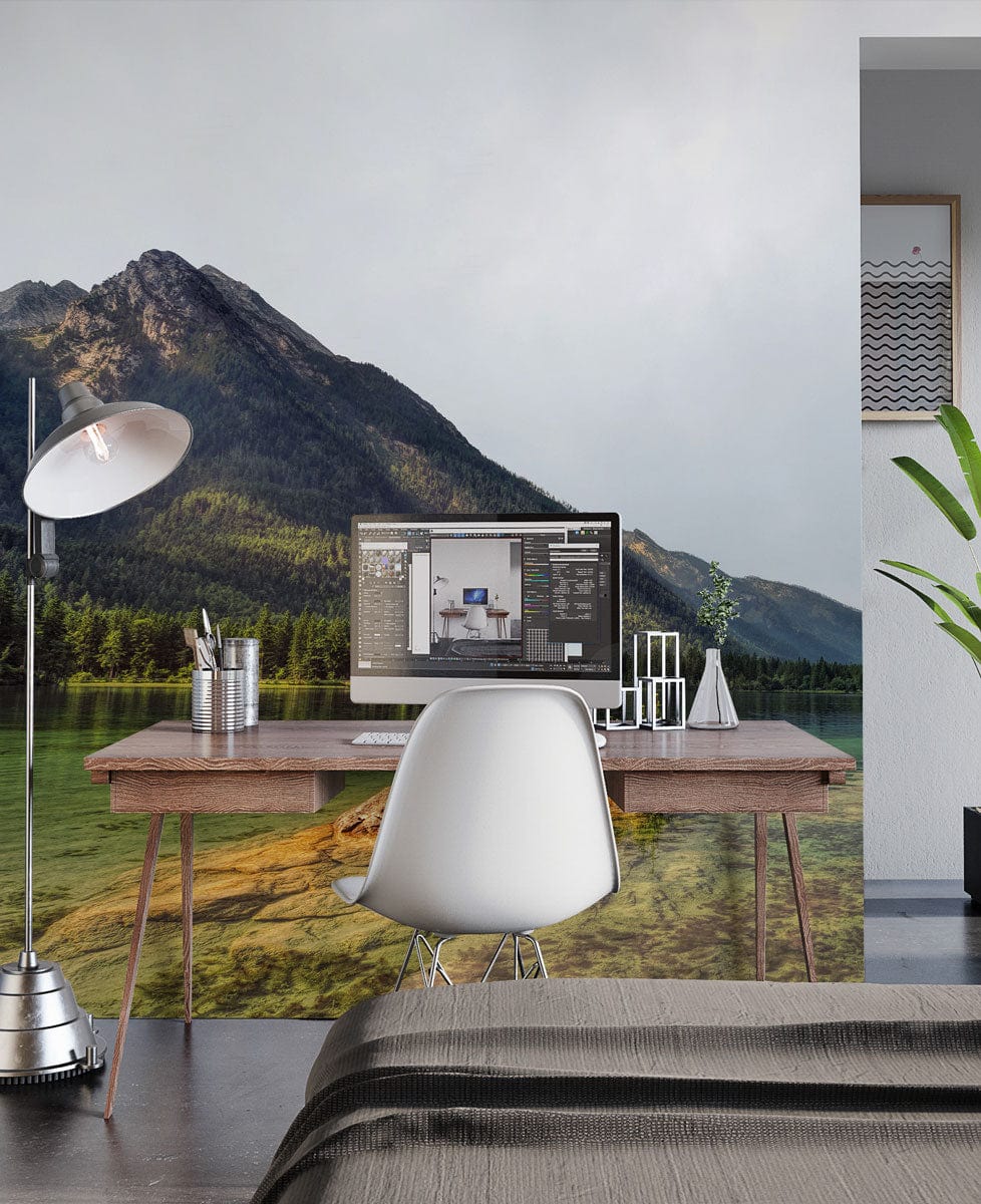 Invite the tranquillity of nature into your home with this exquisite wallpaper mural, capturing a serene mountain landscape mirrored in a pristine lake. The design's intricate details and elegant colour palette offer a sophisticated backdrop that seamlessly merges the natural world with interior elegance, making it an eye-catching feature in any room.