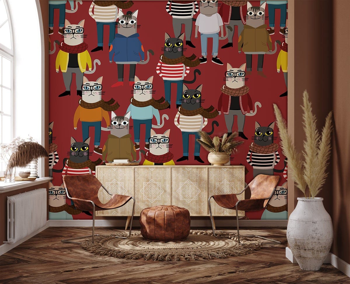 Exquisitely playful and artistic, the Mr Cat Wallpaper Mural serves as a whimsical yet sophisticated addition to any space. Set against a rich burgundy backdrop, this mural portrays a charming assembly of cats dressed in chic attire, each exuding a distinctive personality. The combination of grey, black, and splashes of mustard and red provides a visually dynamic experience, making it a versatile choice for both modern and eclectic interiors.