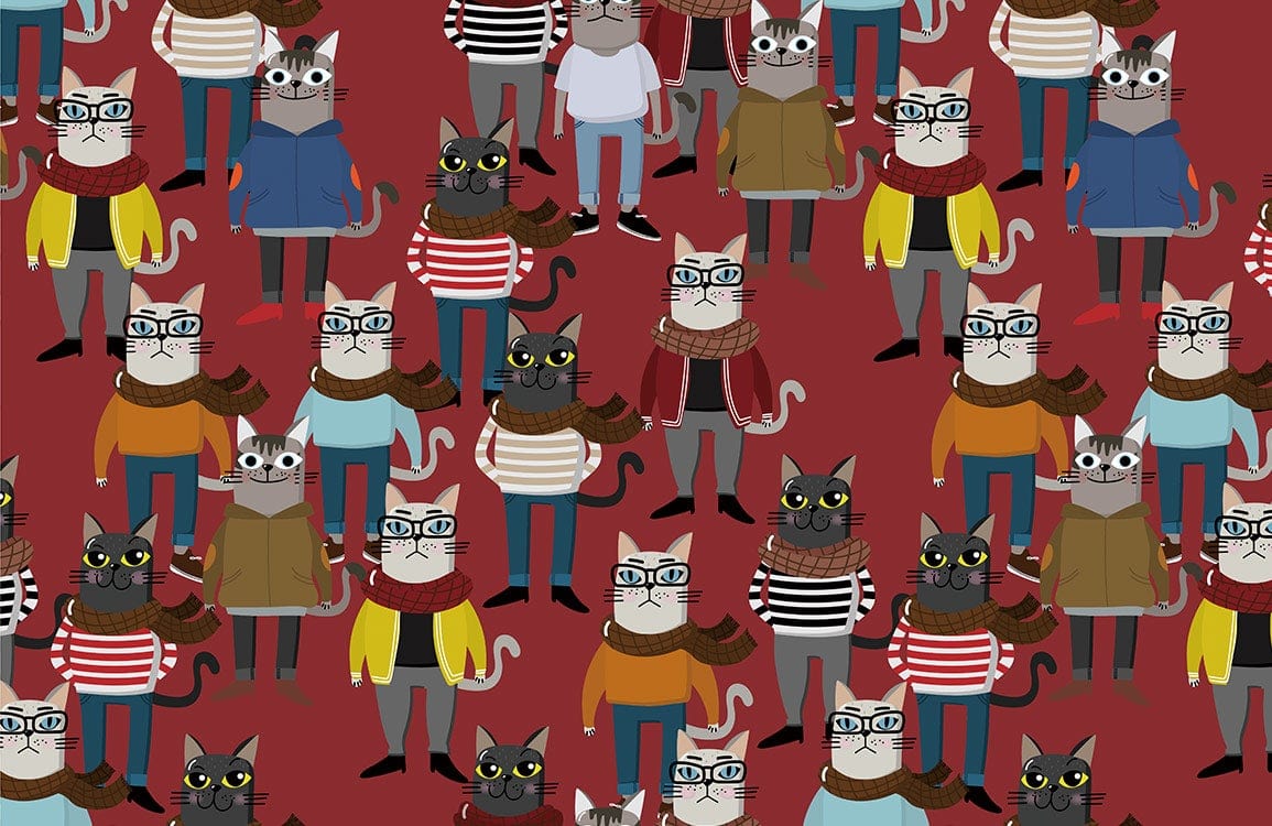 Your Kid loves Cats? complement your kid with this reddish maroon wallpaper that has repetitive pattern of neat cats that will make him enjoys naming them. Our illustrating wallpaper mural will let your Kid imagine there are real characters and he is just their boss. Enjoy giving each cat a name or a description with your child so he can get connected more to his room. The mural wallpaper will also be fascinating in a vet clinic. It will add a fun mood and look to your place with these serious cats and joker face ones who are attentively looking. These cats will be your kids鈥?friends in the nursery where they can learn the colours from their clothes, explain the reactions they see on their faces. Worry free about the suitable furniture and decoration with this Wallpaper because it will make a perfect contrast with any solid colour from the colours of the mural.