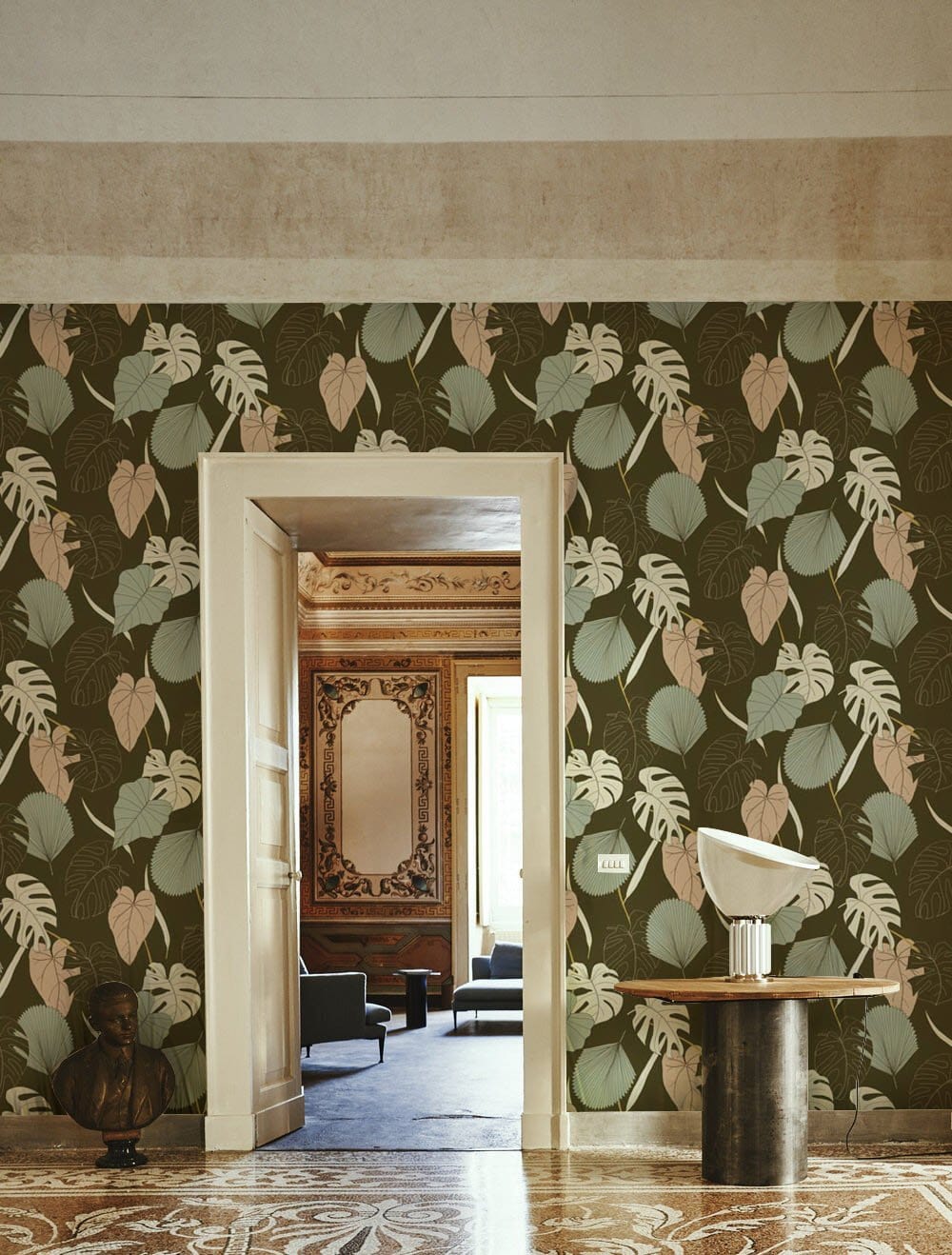 Find the magnificence of life in the lap of nature with this beautiful leaf pattern wallpaper mural. The pastel leaf motifs the perfect way to bring natural environs home. The forest green background gives a vintage yet stylish look on the overall picture. Use it to accentuate a feature wall in your living room, dining area and hallway for an instant fresh feeling.