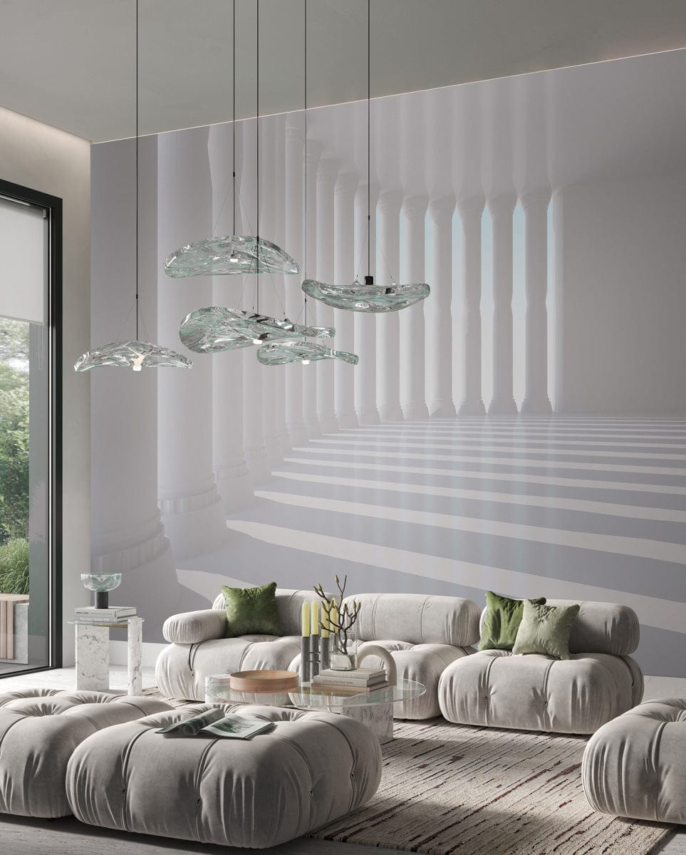 The Mural Timeless Column Perspective Wallpaper captures the serene elegance of classical architecture, offering a visual journey through light and shadow. The beautifully aligned columns create an illusion of depth and continuity. This design suits both contemporary and traditional interior settings, providing a sophisticated backdrop that speaks of grandeur and tranquillity.