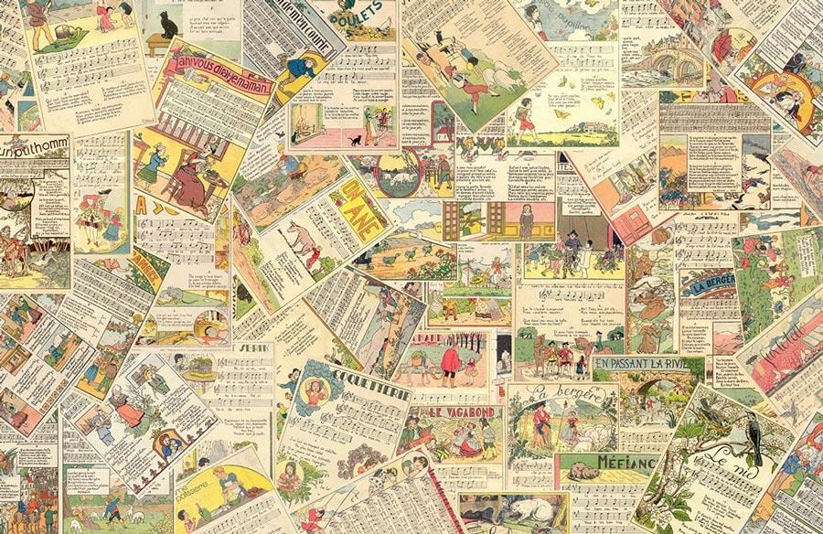 Immerse your space in a captivating collage of vintage charm with the Music Score Wallpaper Mural. This exquisite design features a tapestry of classical sheet music interwoven with vibrant illustrations, each telling a unique story. The layers of music notes and whimsical imagery create a serene yet inspiring backdrop, perfect for those who appreciate a touch of nostalgia. Its intricate artistry and harmonious blend of elements exude a timeless sophistication, suitable for an array of interior styles.