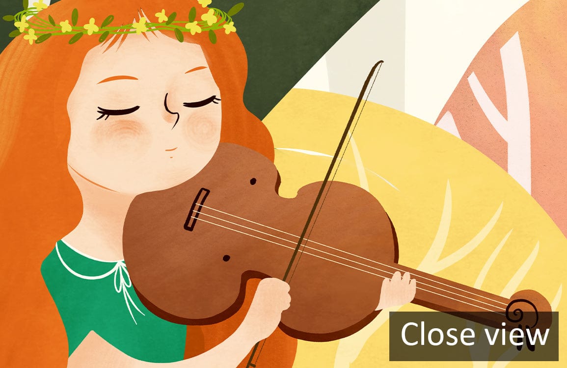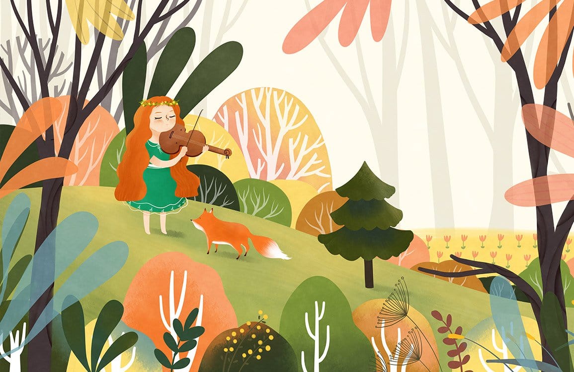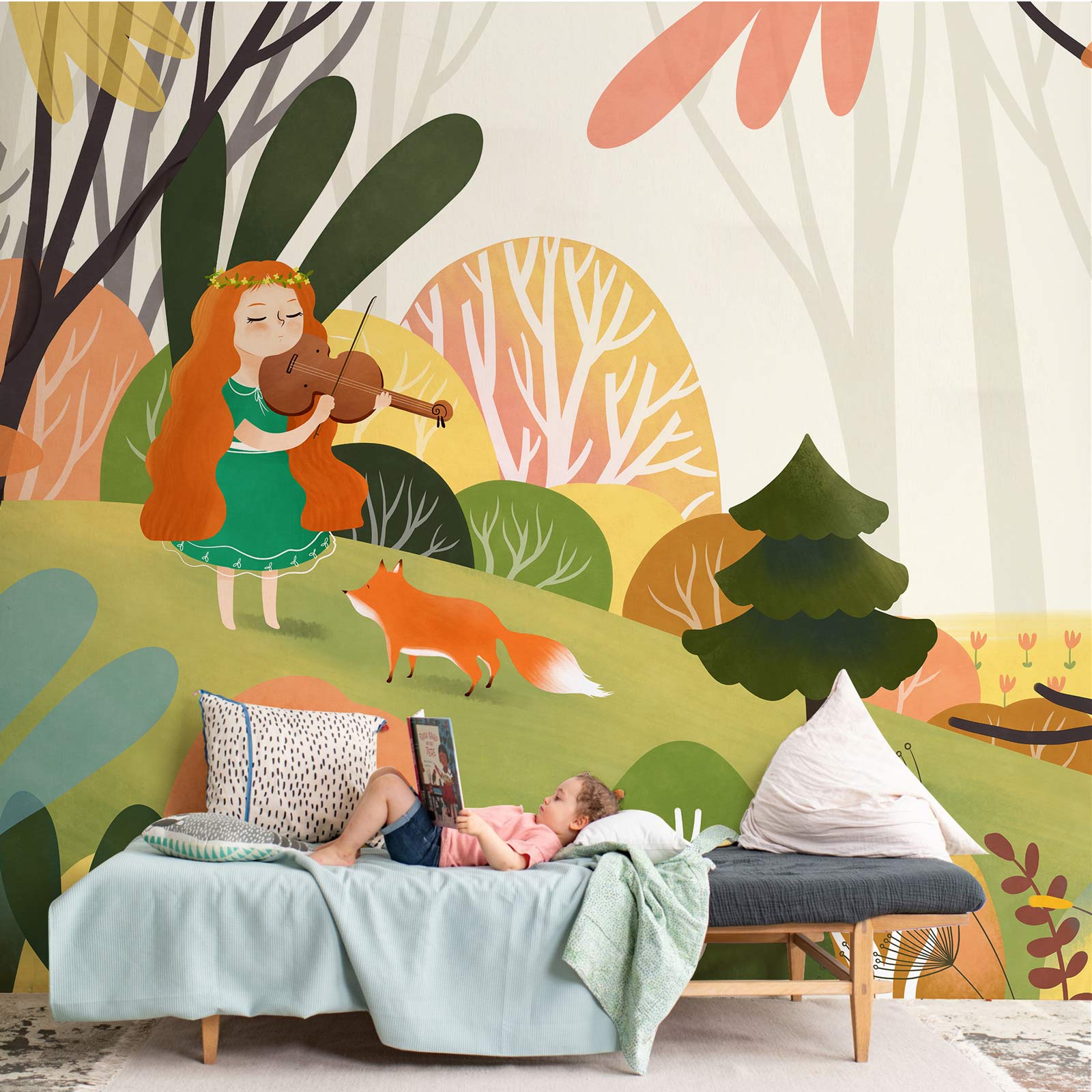 Inspire your child's creativity with this Musician Wallpaper Mural! Featured on a brilliant colourful background, this musical mural features a cartoon girl musician who is holding a violin in her hands. The kid-friendly print set in the playful autumn colour of bright orange and lush green reinforces the message that music prepares the mood for any room and will always be positive and uplifting. Meanwhile, the animal fox design provides an artistic addition to this wonderful mural.