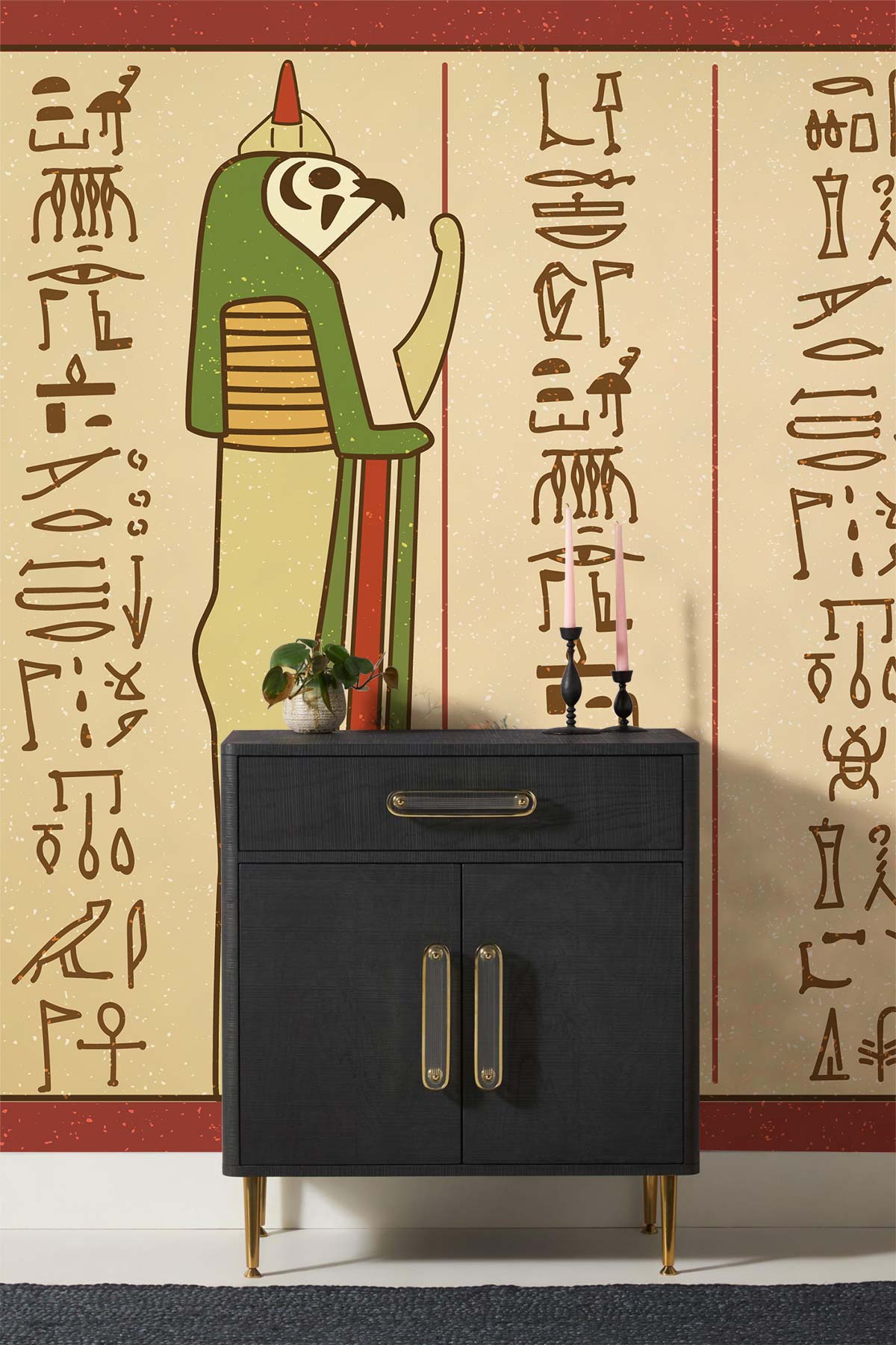 Immerse your space in the mystique of ancient Egypt with this exquisite wallpaper mural. Featuring intricate hieroglyphs and an elegant depiction of deities, it evokes the timeless allure of a bygone era. Delicately balanced hues harmonise with the sophisticated design, making it an ideal backdrop for diverse interiors.