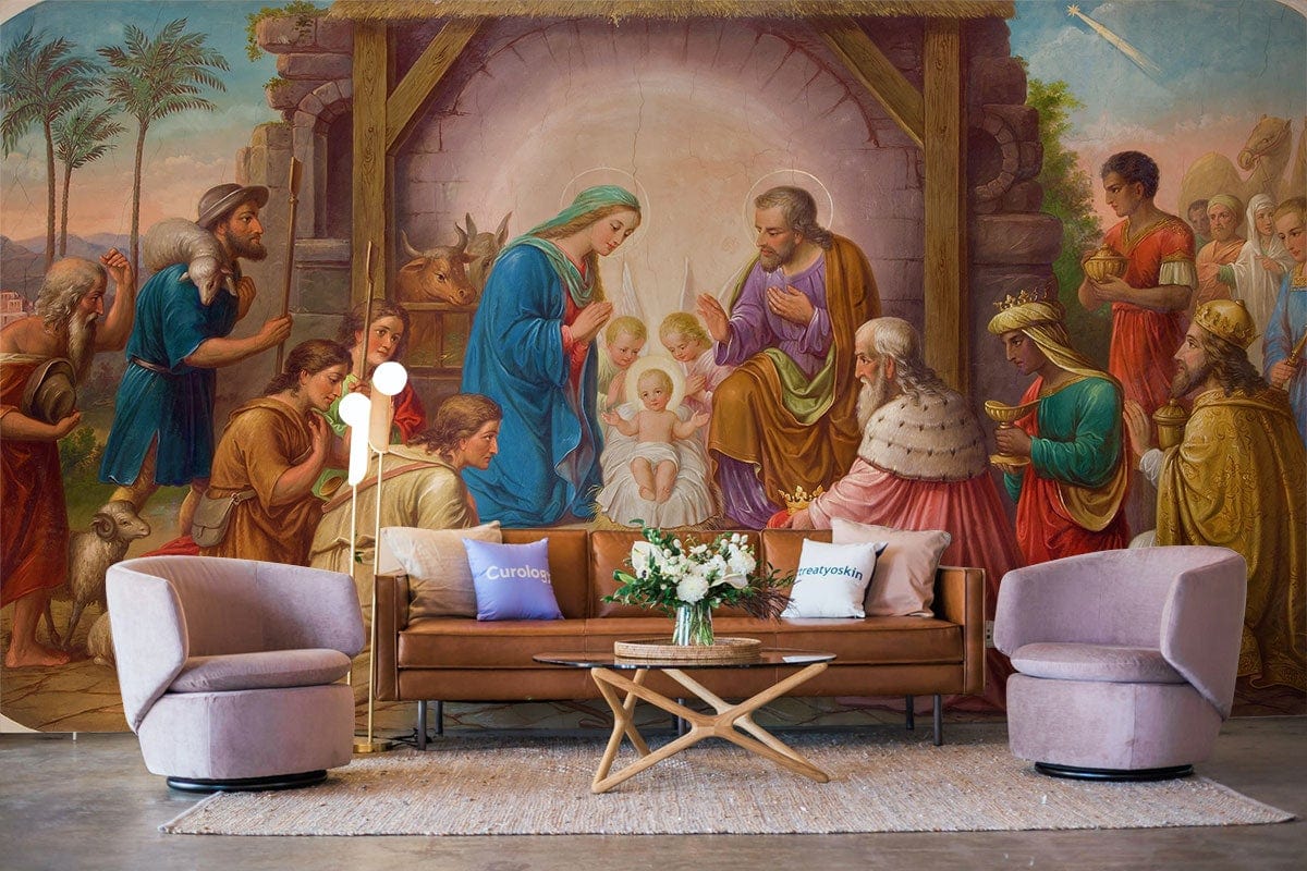 This Nativity of Jesus wallpaper mural captures the sacred moment with exquisite detail and artistry. Vibrant hues of azure, gold, and earthy tones bring to life the serene and mystical ambience of the scene. Delicately woven textures add depth, while the intricate depiction of figures and surroundings imbues your space with a sense of heritage and grace, making it an eloquent choice for any interior setting.