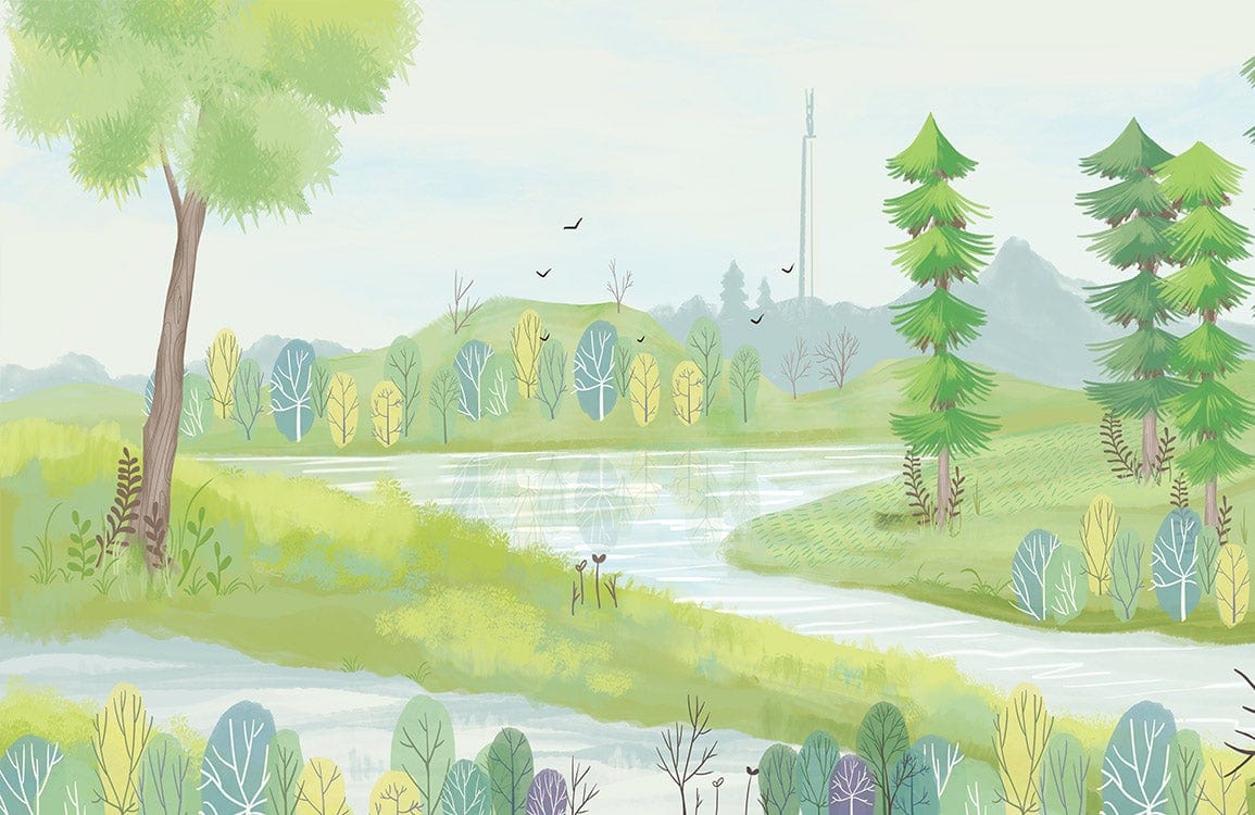 Enjoy the nature and the beauty of simplicity with our natural landscape mural wallpaper of a combination between the beauty of the water embracing with the trees. Small lake with lite grass and the trees is holding this beauty all over and the birds are flying freely and happily. This master piece of art can decorate your place and will fit different room and any place that you wish adding a relaxing and trendy vibe to. It can be perfect at your bedroom, so imagine looking at this beauty first thing in the morning. And it can be also at your kids鈥?room for relaxing mood and more positive vibes.