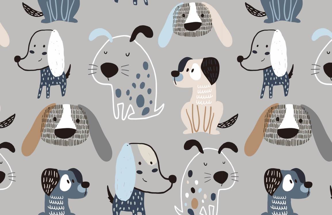 Embrace whimsy and charm with this Bulldog & Sausage Dog wallpaper mural, featuring a playful parade of canine companions. The design weaves together artistic elegance and playful outlines, creating a captivating visual narrative. Varied dog illustrations set against a subtle grey backdrop lend an air of sophistication, making it a delightful addition to any home seeking character and warmth.