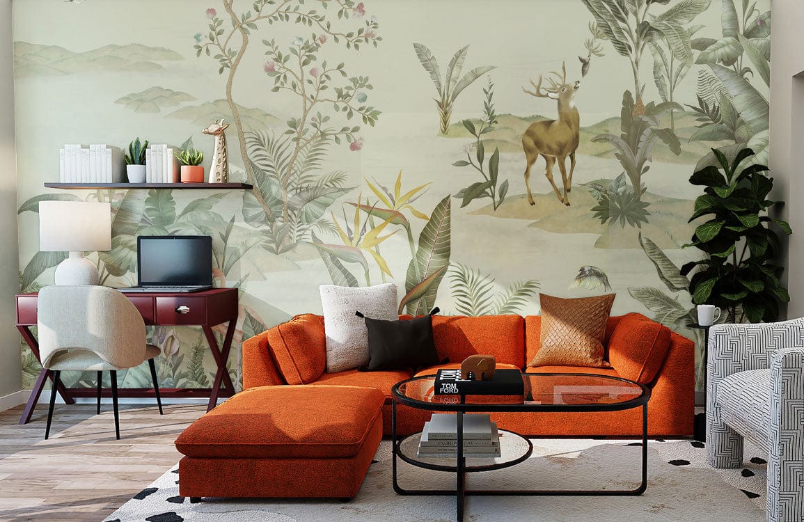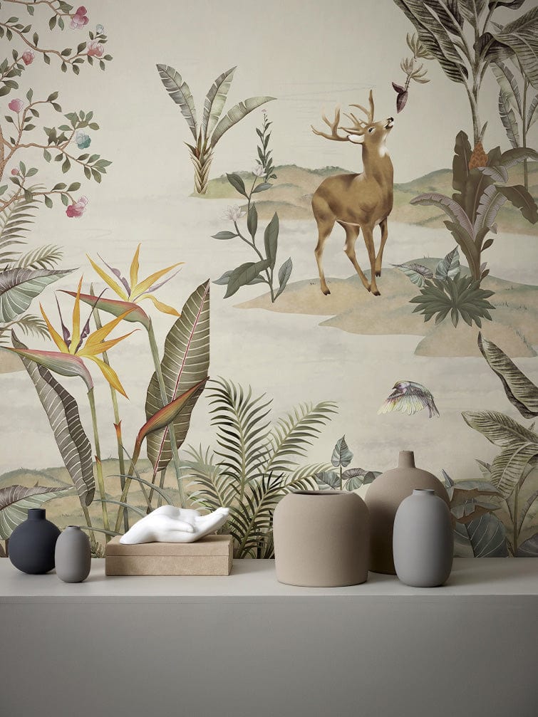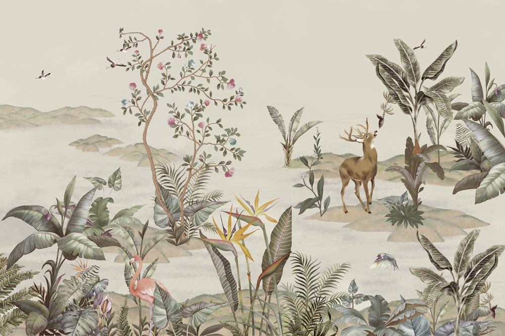 Immerse yourself in the serene elegance of the Wild Forest II Wallpaper Mural, where delicate illustrations of flourishing flora and graceful wildlife evoke a tranquil woodland scene. Exquisitely detailed, the mural captures an enchanting ambience, bridging the outdoors with refined interiors. Its striking yet subtle presence is ideal for creating a sophisticated focal point in any room.