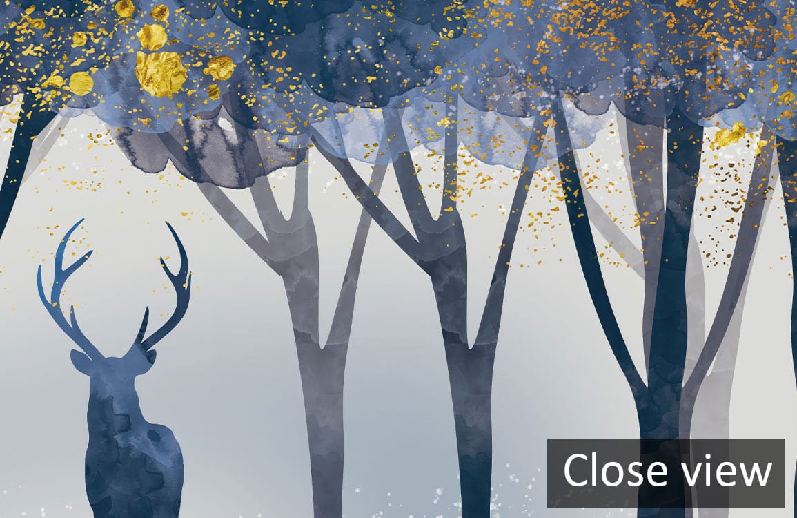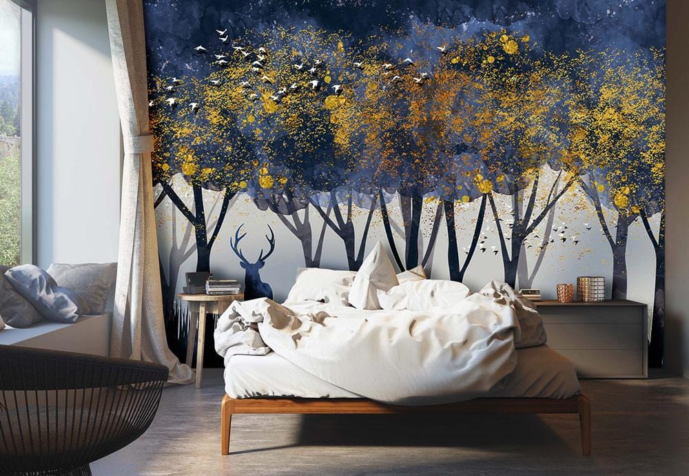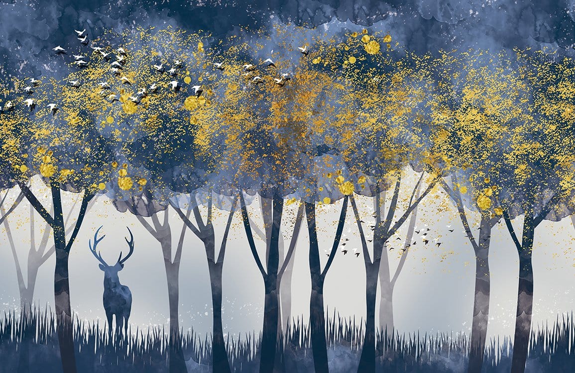Evening Grove Wallpaper Mural unveils a serene woodland scene, artfully blending shadows and light. The mural's intricate design features tall, graceful trees highlighted by shimmering golden leaves beneath a deep, sapphire sky. The silhouette of a majestic stag adds depth and allure, making it an exquisite backdrop for both classic and contemporary interiors.