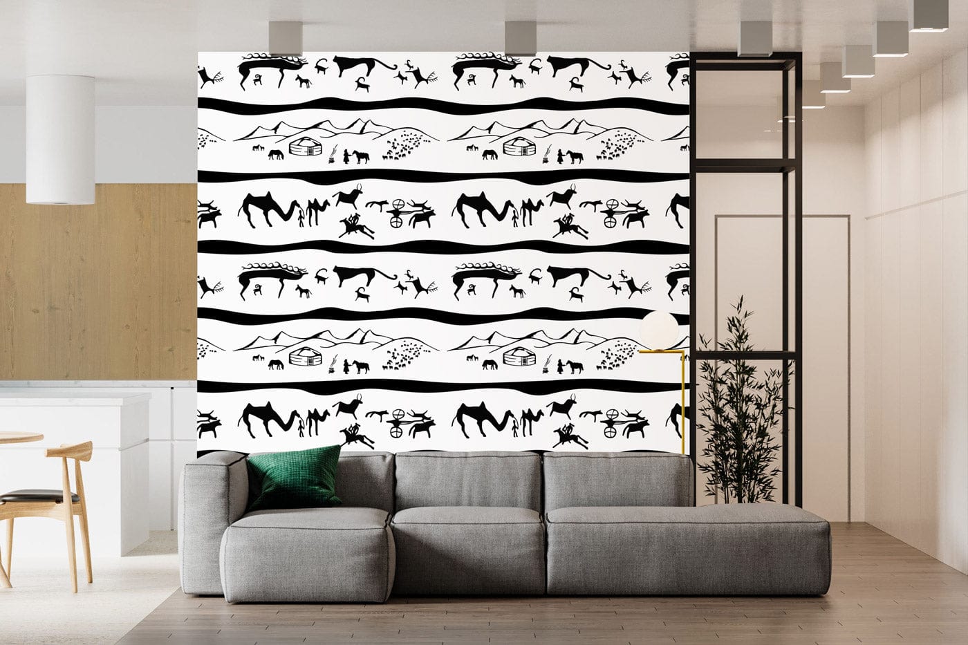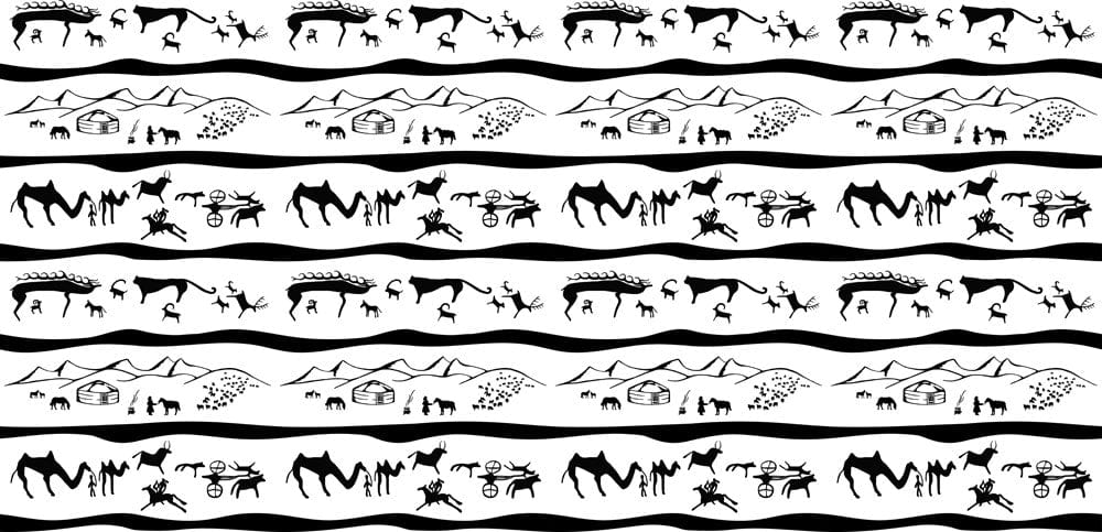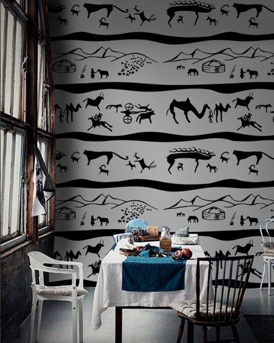 Embrace the adventurous spirit of the Nomadic Life Journey Mural Wallpaper. This exquisite design features a rhythmic pattern of nomadic landscapes with intricate silhouettes of camels, huts, and cacti, set against a timeless monochrome palette. Its harmonious blend of textures and symmetrical lines creates an elegant visual narrative that seamlessly complements modern and traditional interiors alike.