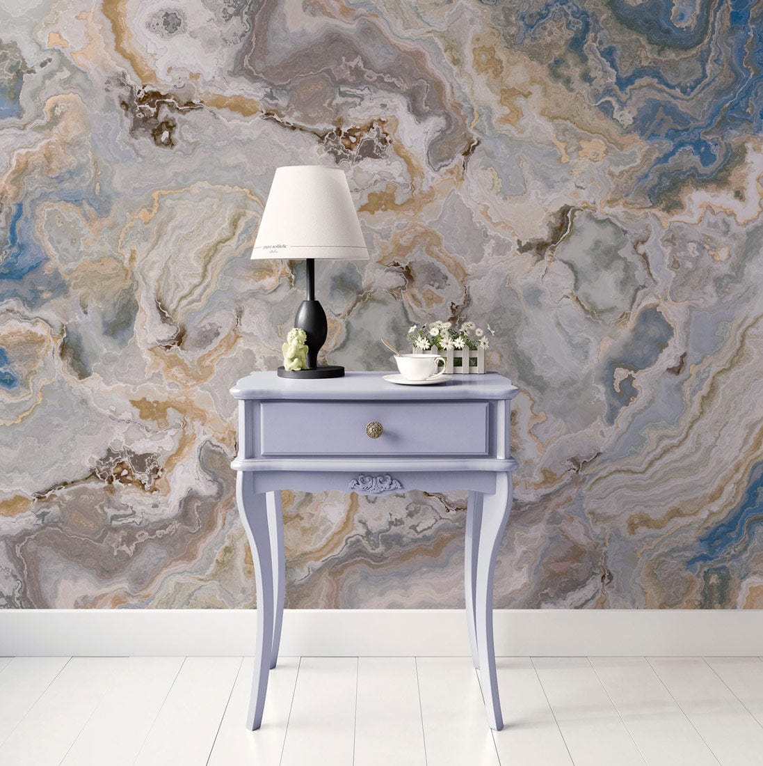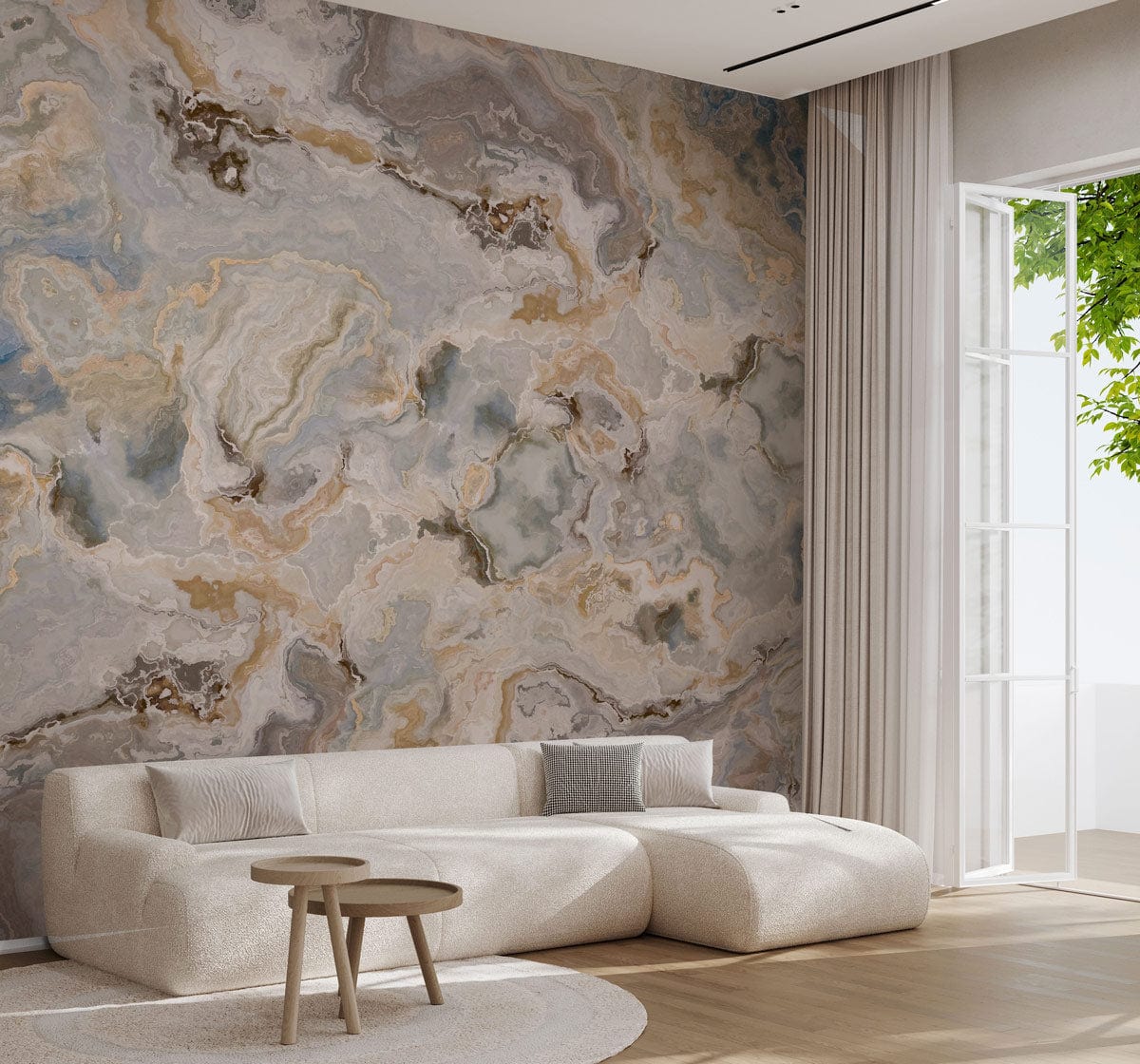 The Ocean Breeze Marble Mural Wallpaper artfully captures the serene flow of marble with its swirling patterns. Delicate hues of blue, beige, and grey create an atmosphere of calm sophistication, seamlessly fitting into both modern and classic interiors. The marble's intricate textures are brought to life, offering an exquisite backdrop that echoes the tranquility of ocean waves.