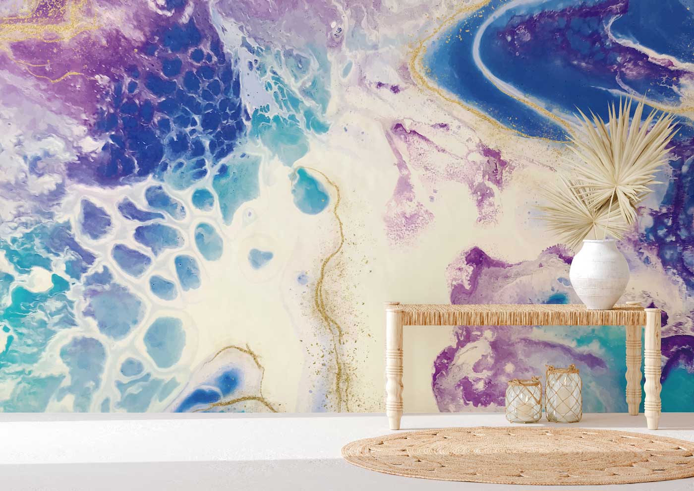 Create an eye-catching space in your home with our colourful ocean water wallpaper mural. This blue and purple artistic design is infused with modern and abstract, and will surely spice up your interior space and make whoever see it excited. Perfect wallpaper for your bathroom, bedroom and hallway.