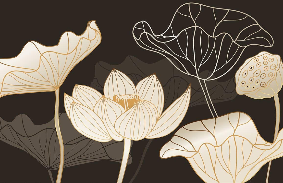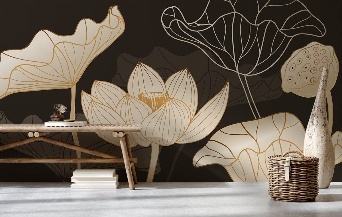Embrace a serene ambience with the Off-white Lotus Flower Wallpaper Mural, where delicate blossoms float gracefully on a deep background. The intricate gold outlines lend an exquisite touch, crafting a sophisticated and timeless setting for your interiors. Perfectly suited for spaces seeking an artistic yet understated elegance, this mural weaves natural beauty with luxurious detail.