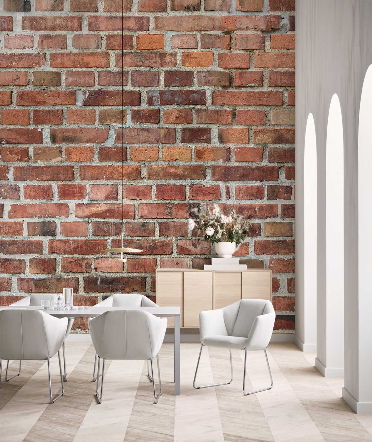 The old classic red聽brick wallpaper聽is one of the forever trendy designs that will not make you confused while choosing a simple design that suits all the styles and all the tastes. This simple traditional brick design can match anything, modern decoration or academic decoration and furniture or even semi classic decoration. This reddish and light brown bricks look so real and they can match everything and can be added to any style and still will look so chic, so keep your home, office, kitchen or your bathroom so chic with this mural wallpaper. The shades of light brown and reddish taste in the wallpaper give a bohemian style. Don鈥檛 miss to ask about the designing tricks and ideas we offer.