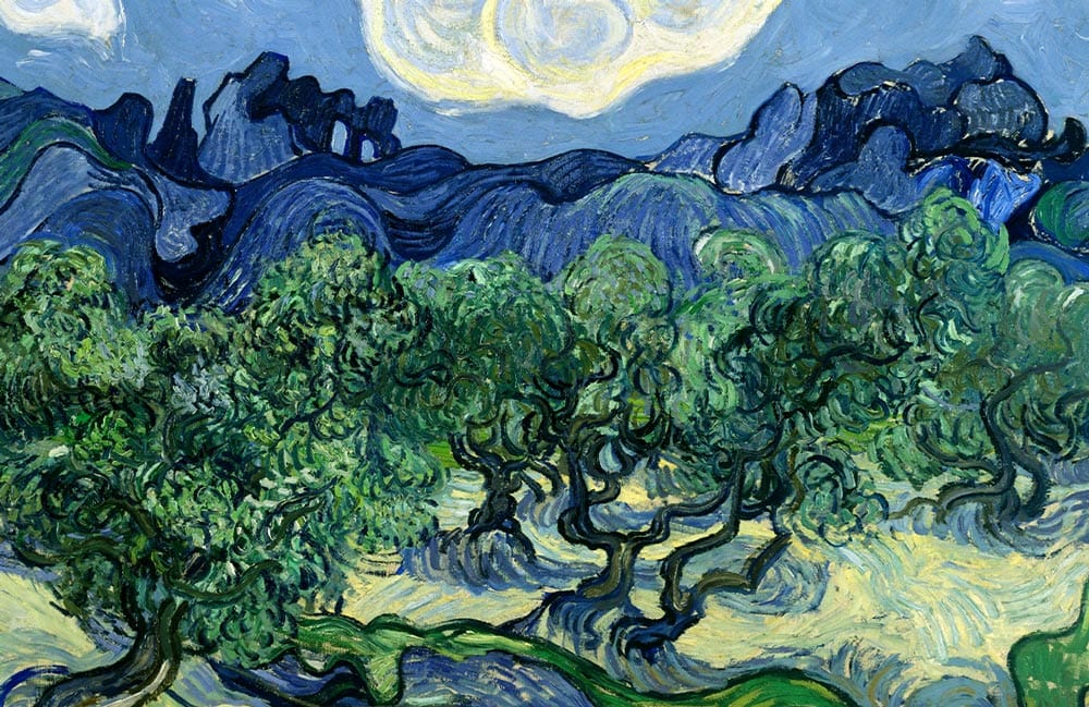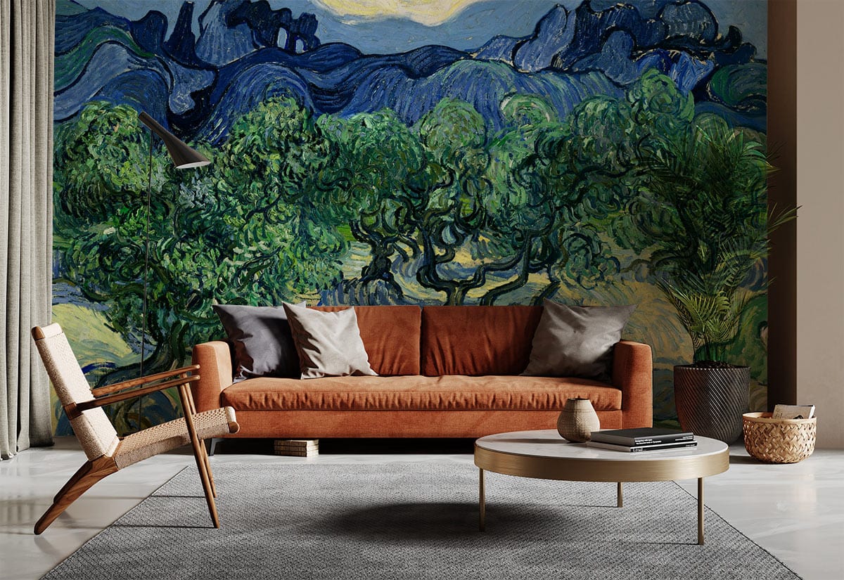 The Olive Trees Wallpaper Mural captures the profound beauty of a sunlit grove, with lush green foliage and deep blue skies swirling in artistic harmony. This sophisticated depiction adds a layer of timeless elegance, seamlessly complementing both traditional and contemporary interiors.