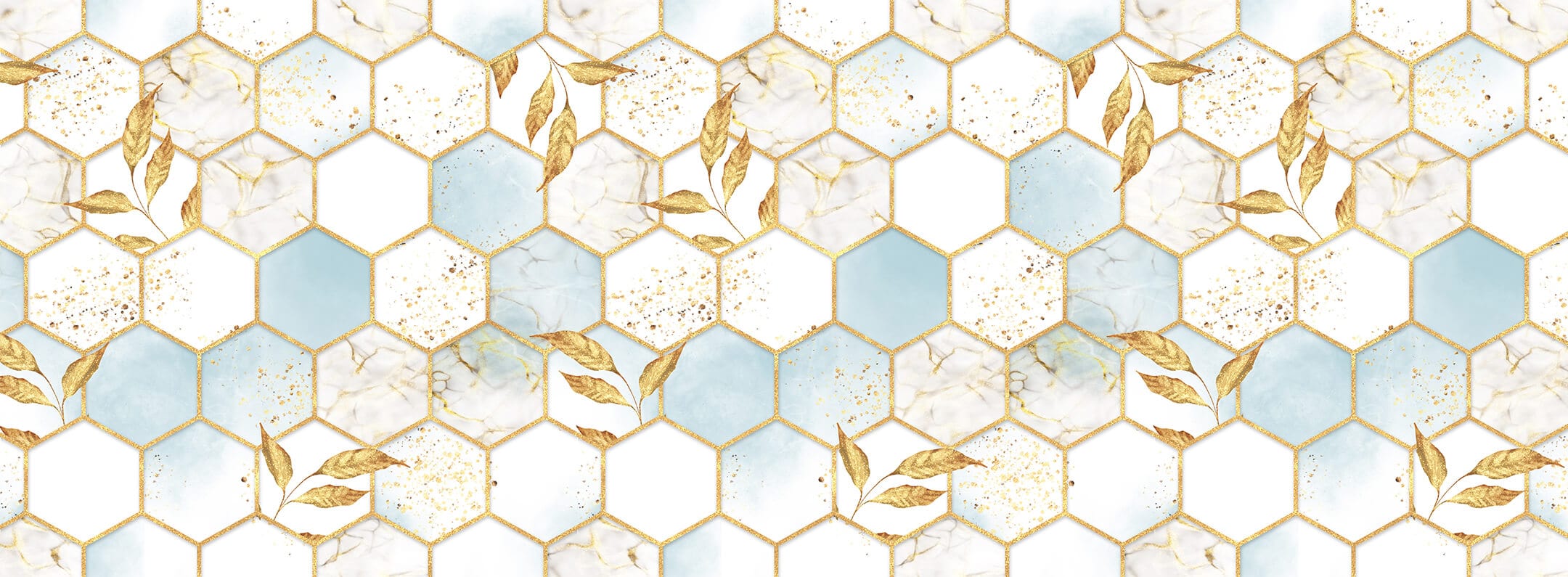 Experience a harmonious blend of geometric sophistication and organic elegance with the Ombre Hexagons Wallpaper Mural. This design intricately weaves soft blue hexagons with subtle gold accents and delicate leaf motifs, creating a visually enchanting tapestry. Its delicate ombre shading adds depth, making it a perfect backdrop for both contemporary and vintage settings.